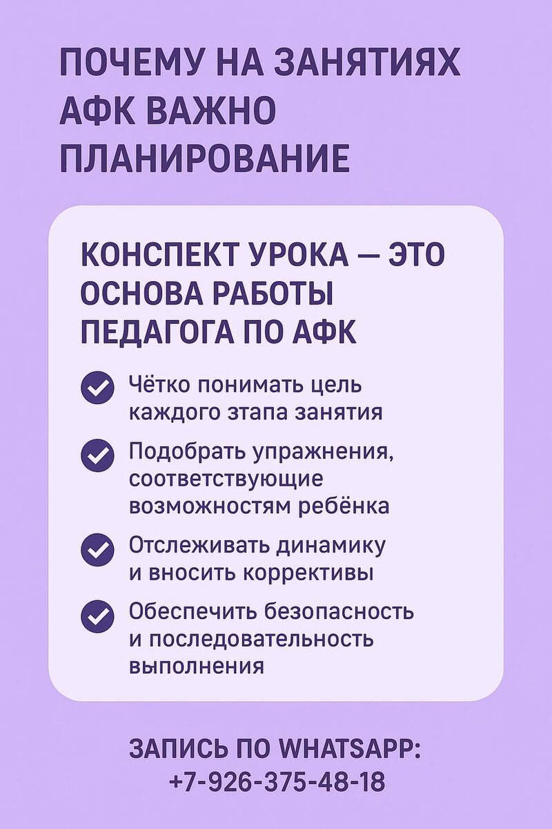 🔶 Почему на занятиях АФК важно планирование 🔶 На первый взгляд может показаться, что занятие по адаптивной физической культуре — это просто набор упражнений. Но на самом деле каждое занятие должно быть тщательно спланировано. 📋 Конспект урока — это основа работы педагога по АФК. Он помогает: ✅ Чётко понимать цель каждого этапа занятия. ✅ Подобрать упражнения, соответствующие возможностям ребёнка. ✅ Отслеживать динамику и вносить коррективы. ✅ Обеспечить безопасность и последовательность выполнения. Без планирования невозможно достичь устойчивого результата. Ведь адаптивная физическая культура — это не просто движение, а целенаправленное развитие моторики, сенсорики, внимания и поведения ребёнка. 👨🏫 Каждый педагог по АФК должен приходить на занятие с готовым конспектом, где прописаны цели, задачи, оборудование, последовательность упражнений и способы адаптации под конкретного ребёнка. 📈 Именно системный подход делает занятия эффективными и позволяет родителям видеть реальный