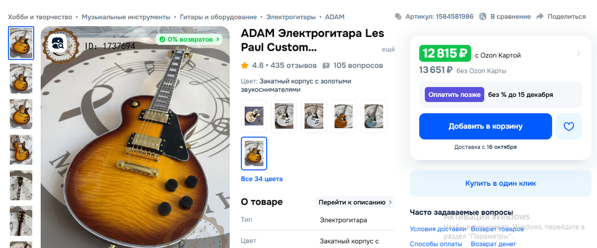 Другая крайность поразила меня совсем недавно. Попросили наладить только что купленный "китайский Les Paul". Чего только не делают в нашем старом добром Китае. С трех шагов было ясно, что гитара — совсем не les Paul, но лишь по косметическим признакам: лак, фурнитура, сам почерк производства. Но это визуально. По сути же, как музыкальный инструмент, гитара сделана подчёркнуто опрятно и добросовестно. Разумеется, арчтоп резонатора — только шпон волнистого клёна, разумеется махагон — Федот, да не тот, но.... Вот всё очень неплохо, даже и очень неплохо! И анкерный стержень с хорошим КПД, нигде не кривит, лады забиты качественно, приемлемо высокие. И потому гитара была налажена хорошо без мук и проблем. Звучание. Та же оценка: уверенное "не плохо", если не сказать "хорошо". И само дерево и звукосниматели. В одной из своих публикаций рекомендовал к покупке подобную реплику Les Paul , Корд за 42 тыс. руб. и это было шикарное предложение в смысле "цена-качество". vk.com/wall-108430619_560 (в статье отзыв владельца). Теперь приходим к тому, что и в самом деле удивительно. Если американский Deluxe — неудивительно, естественно, то есть органически дорого, то этот китаец — просто немыслимо, баснословно недорого. В августе месяце этого года был куплен на Озоне за сколько бы вы думали? За 12 815 рублей и ни копейки больше! Они там что, Святым Духом сыты, в этом своём Китае? "ADAM"... райское какое-то бескорыстие.