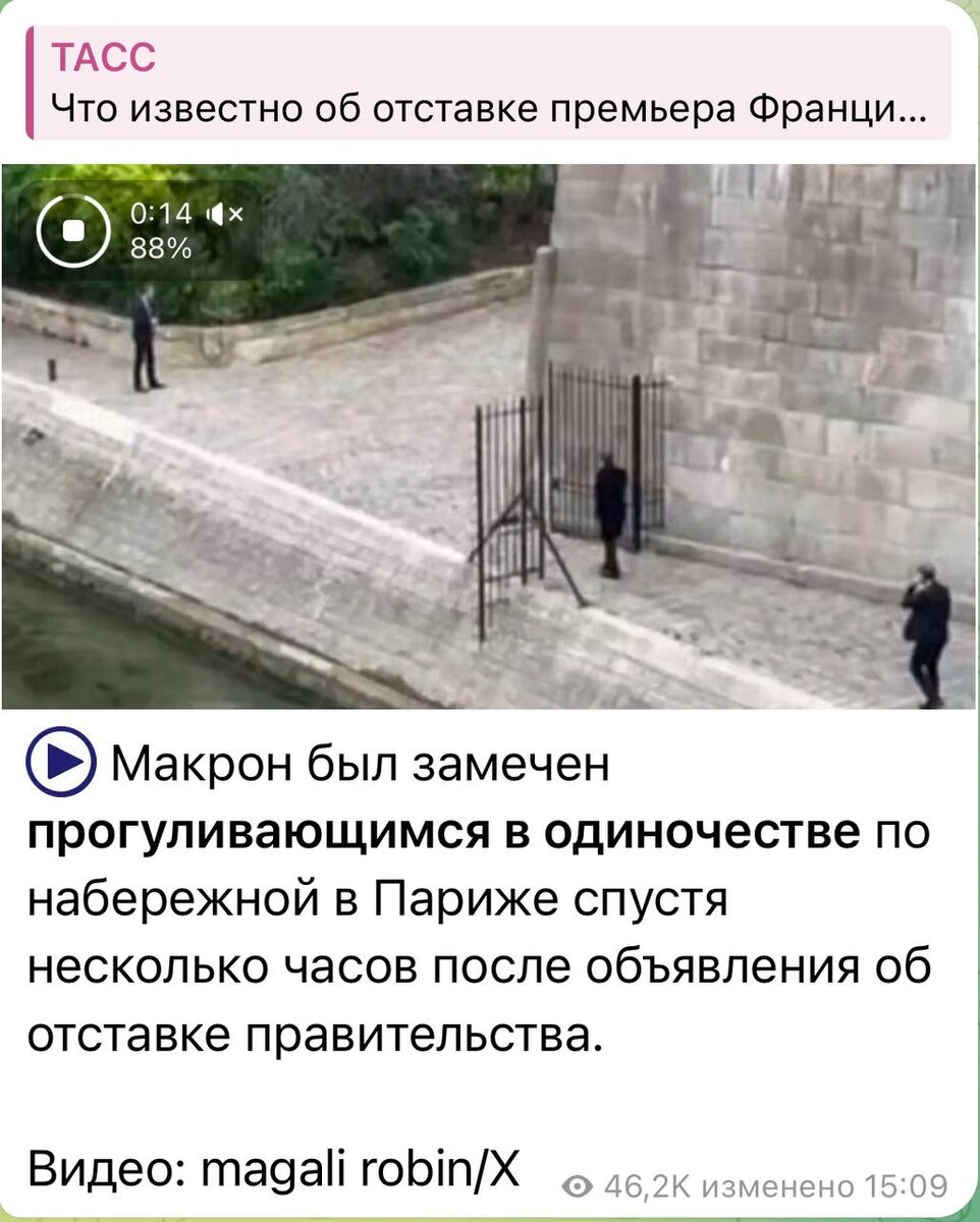 Вот и на этот раз «чисто случайно» пролетавший в зоне прогулки первого лица коптер снял одиноко прогуливающегося Макрона. Грусть об отправленном в отставку правительстве мурашками побежала по коже телезрителей… Какая боль, какая боль…