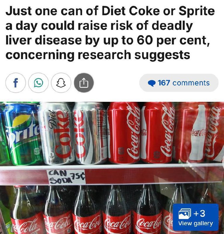 Всего 250 миллилитров диетической газировки в день (меньше половины банки!) повышают риск ожирения печени на 60%. Любители классической версии тоже не в безопасности — обычная Кола увеличивает этот риск на 50%.