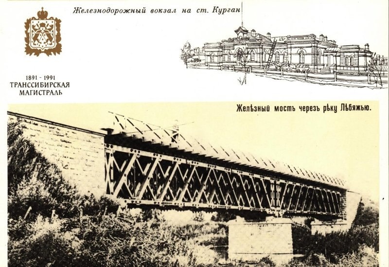 Железнодорожный вокзал на ст. Курган. Железный мост через реку Лебяжью. Открытка из комплекта «Транссибирская магистраль. 1891-1991» | 1991 г. Железный мост через реку Лебяжью. Железнодорожный вокзал на ст. Курган. Использованы материалы фондов Центрального музея железнодорожного транспорта СССР. г. Ленинград Источник: Федеральное государственное бюджетное учреждение культуры "Центральный музей железнодорожного транспорта Российской Федерации" https://vk.cc/cQ928q