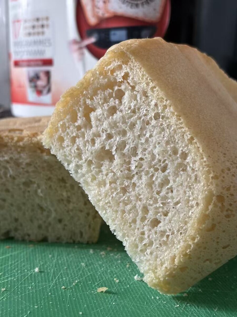 С третьей попытки наконец-то получился нормальный хлеб — тот самый, привычный нам, а не местная булочка под видом тоста. Вчера нашёл в магазине муку первого сорта, и вот на ней хлеб вышел вкуснее, чем с высшим. Текстура грубее, но приятная — не ватный батон, а хлеб, у которого есть характер. Делал всё на сухих дрожжах.