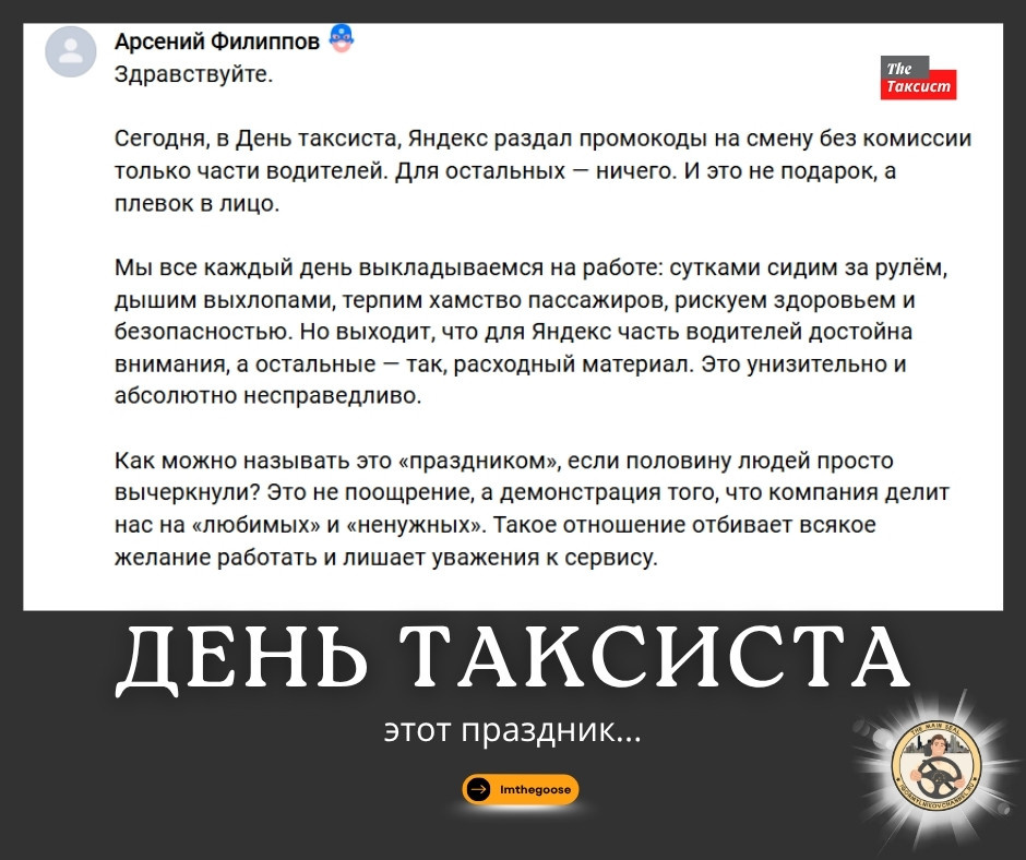 К сожалению, это так! Метрики Яндекс Такси не включают в себя водителей, их лояльность, качество работы, срок службы на линии, текучку и пр. и пр. пр. Почему я так решил спросите вы уважаемый читатель кем бы вы ни были? Я отвечу. Читаю сегодня ветку в Вк группы Яндекс Про Водители за 4 октября в которой агрегатор выкатил новый ролик об Антологии (надо бы написать обзор о нём, но руки всё не доходят) а водители пишут о поздравлении с днём таксиста, который теперь по мнению Яндекса нужно праздновать вместо 22 марта, когда его празднует весь Мир… Готовы? 1. «Это не подарок, а плевок в лицо» Многие водители возмущены тем, что промокоды на смену без комиссии получили только некоторые. Остальные почувствовали себя обделёнными. Люди пишут, что это несправедливо и унизительно они сутками крутят баранку, терпят хамство пассажиров, рискуют здоровьем, а в итоге «Яндекс выбрал избранных». Часто звучит мысль: «Если вы цените водителей — цените всех, а не делайте показуху». 2. «Раздали тем, кто мало