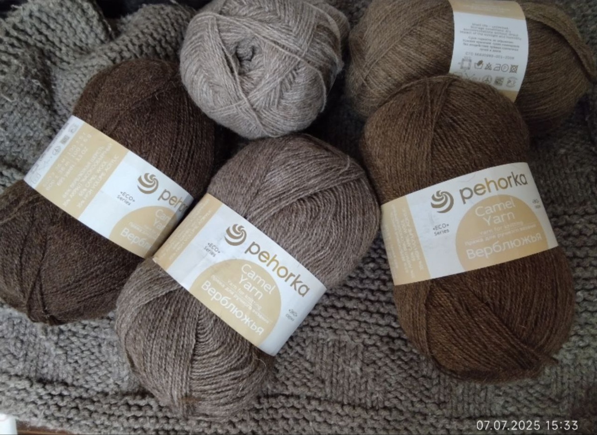 ℹ️ Ставьте нравится 👍, Комментируйте 💬, Делайте репосты 📤, Подписывайтесь на канал 🖊. Мне как автору крайне важна ваша поддержка 😀 Для вязания большинства своих любимых шалей я обычно покупаю пряжу Верблюжья от Пехорской фабрики. Мне нравится эта пряжа: она достаточно тонкая, средней скрутки, слегка пушится. Вязать из нее приятно. Длинных остовых волокон не так много. Цвета натуральные, очень красивые, с легким меланжевым эффектом. В этот раз в магазине было 5 оттенков