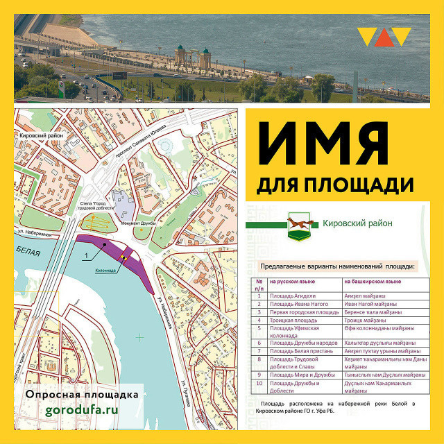 Администрация Уфы просит жителей города выразить свое мнение о предполагаемом присвоении наименования площади, расположенной на набережной реки Белой в Кировском районе. Голосование доступно по ссылке. Среди предложенных вариантов названий площади: Троицкая, Дружбы народов, Ивана Нагого, Агидели, Трудовой доблести и славы, Мира и дружбы, Дружбы и доблести, Уфимская колоннада, Белая пристань и Первая городская. Голосование организовано на опросной площадке администрации Уфы и завершится 13 октября. Для участия необходима авторизация.