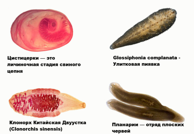 Объяснение: Цистицерки (личинки свиного цепня), клонорх китайский и планарии — все относятся к типу Плоские черви (Platyhelminthes). Улитковая пиявка относится к типу Кольчатые черви (Annelida). Ответ: