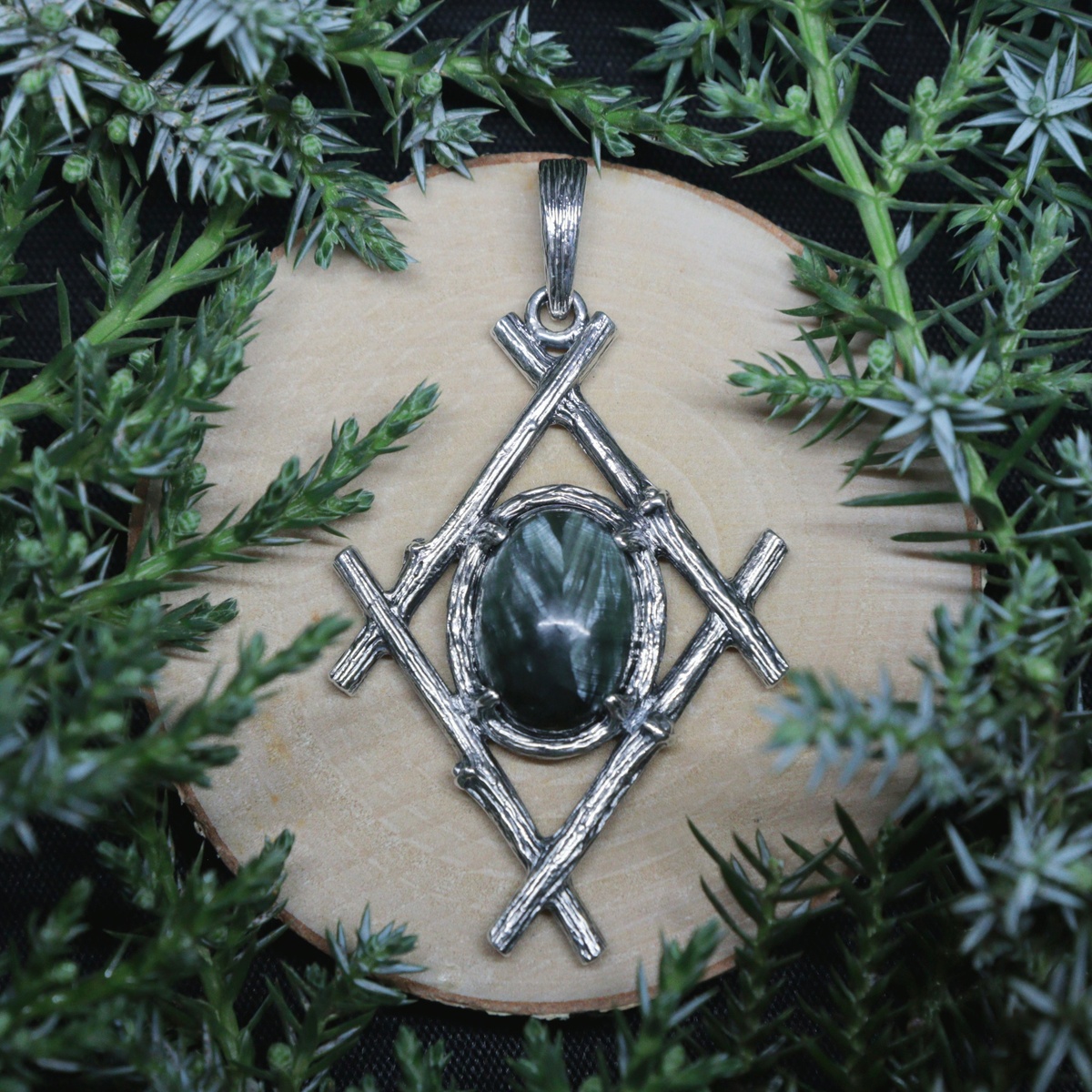 Сделан на заказ и уже отправился к своей волшебнице 🌿 Заказчица хотела, чтобы серафинит был с самым хвойным и лесным рисунком, в итоге из нескольких камней мы выбрали тот, который на фото. Его природный узор напоминает склонившиеся хвойные веточки, скрывающие тайны загадочной лесной чащи. Кулон "Амулет Лесной волшебницы" сделан в виде перекрещенных веточек ивы. Ветви скопированы с настоящих и отлиты в металле, поэтому полностью повторяют все их особенности. Такой дизайн кулона задуман как отсылка к народным оберегам и амулетам, которые делали из переплетения веточек или трав. Фактура коры на оправе камня и петельке нанесена вручную и дополняет природную стилистику кулона.