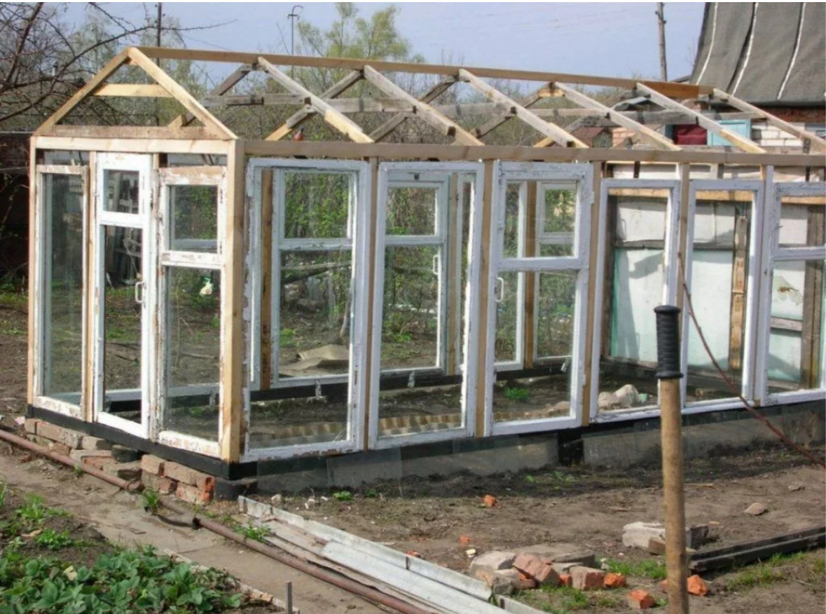 С использованием старых деревянных рам можно выстроить весьма надежный и крепкий каркас, который будет поддерживать конструкцию теплицы на протяжении долгих лет.