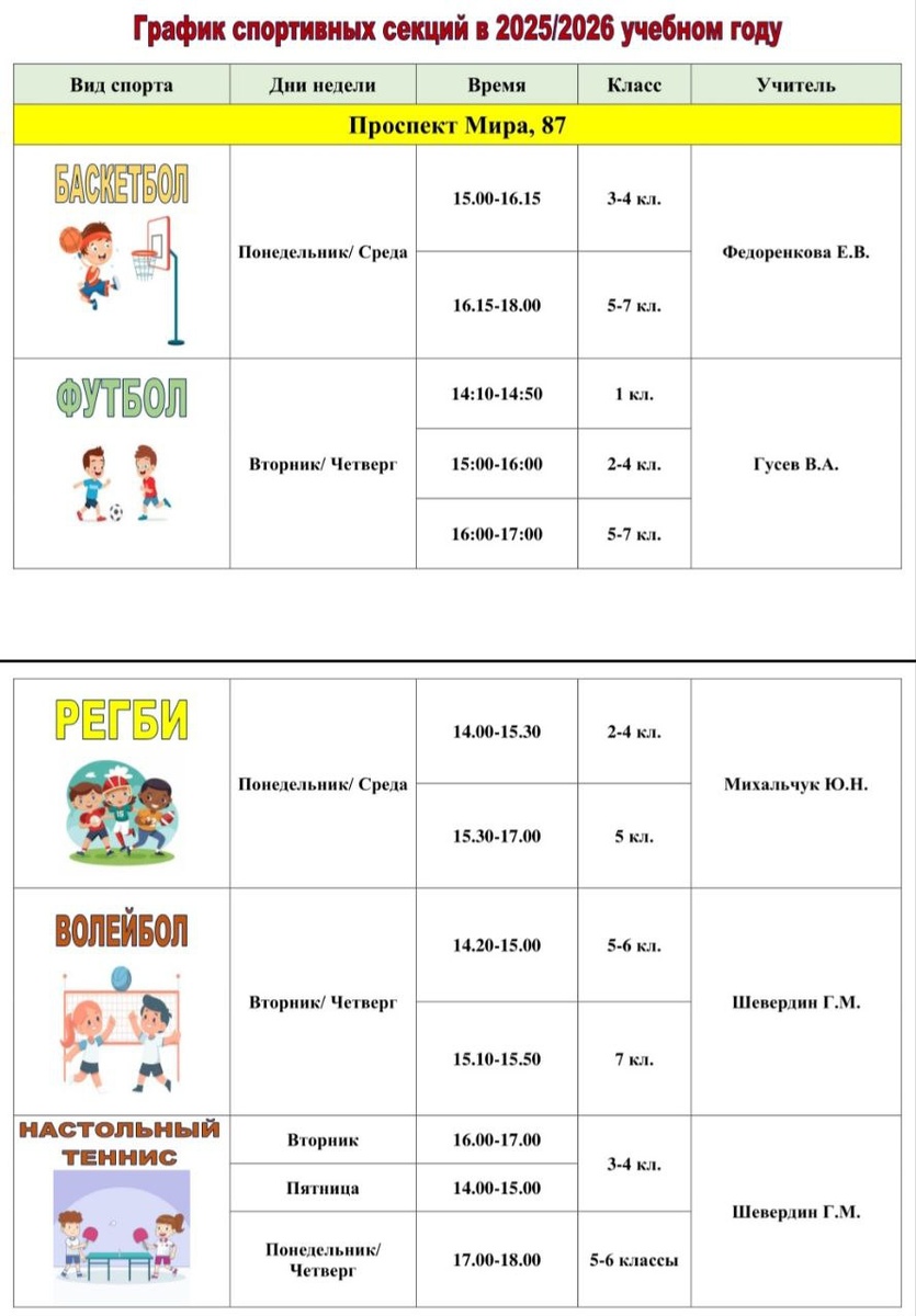 Полное расписание работы спортивных секций в 2025-2026 учебном году.
