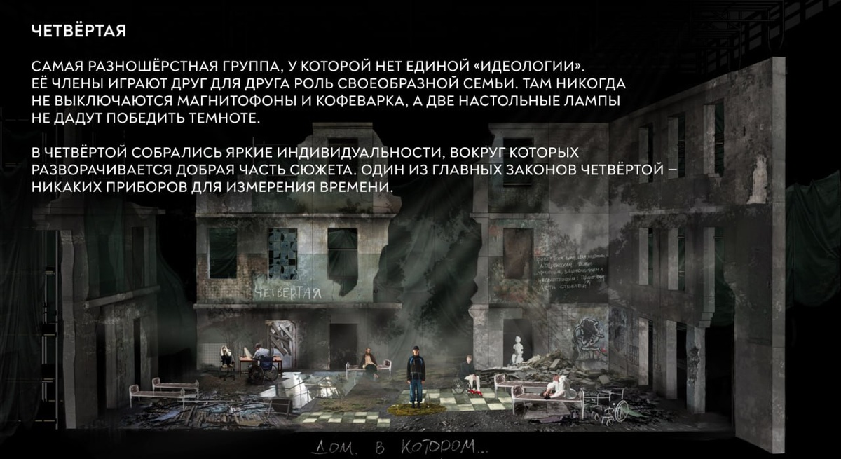 Знакомимся с лором Дома 🏠 До премьеры спектакля «Дом, в котором...» по одноименному роману Мариам Петросян осталось 24 дня. Делимся с вами сценографией Нади Скомороховой и рассказываем о доме и его обитателях. Дом — интернат для детей–инвалидов, но для самих обитателей он значит намного больше, чем просто временное место жительства. Дом состоит из 6 стай: «Четвёртая», «Крысы», «Птицы», «Фазаны», «Логи» и «Псы». Мы приготовили для вас карточки, на которых рассказываем о каждой стае. Ждете премьеру? Пишите в комментарии! 🟥 «Дом, в котором» | 16+ 31 октября | 18:00 1 ноября | 17:00 2 ноября | 14:00 Купить билеты