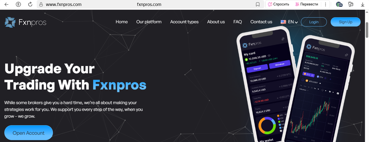 Брокер Platform.fxnpros.com (Fxnpros.com) активно продвигает себя как надежную платформу для инвестиций и торговли на финансовых рынках. На сайте можно увидеть заявления о профессионализме аналитиков, индивидуальном подходе и гарантированных доходах. Однако за привлекательной рекламой скрывается схема, типичная для финансовых мошенников, чья цель — не приумножить капитал клиента, а полностью его присвоить.