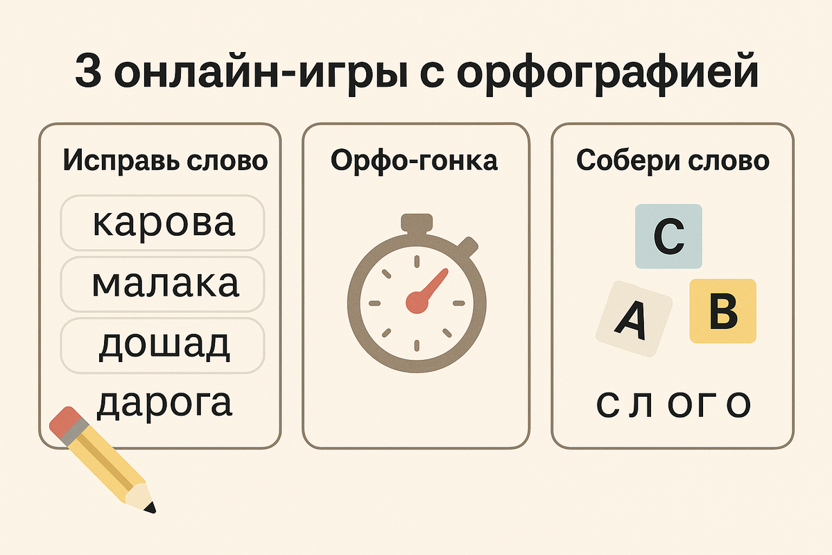 Русский язык пугает детей обилием правил. «Почему в одном слове пишется А, а в другом О?» — спрашивают они. Но когда орфографию подают не как скучные таблицы, а как игру, всё становится понятнее и веселее. Почему онлайн-формат помогает: – можно сразу показывать слова на экране и выделять нужные буквы цветом; – используются интерактивные игры: кроссворды, «найди ошибку», словесные гонки; – ребёнок моментально видит результат и радуется успехам. 3 онлайн-игры для запоминания орфографии: «Исправь слово» — на экране слова с ошибками: карова, малако, лошад, дарога. Нужно щёлкнуть по неправильным и написать правильно. «Орфо-гонка» — педагог включает таймер, а ребёнок быстро находит слова с одной орфограммой. «Собери слово» — из набора букв нужно составить правильное слово. Почему детям нравится: Игры вызывают азарт. Ребёнок не зубрит правило — он ищет, пробует, запоминает. А мозг лучше усваивает то, что связано с эмоцией и движением. Вывод: онлайн-игры делают русский язык живым и пон