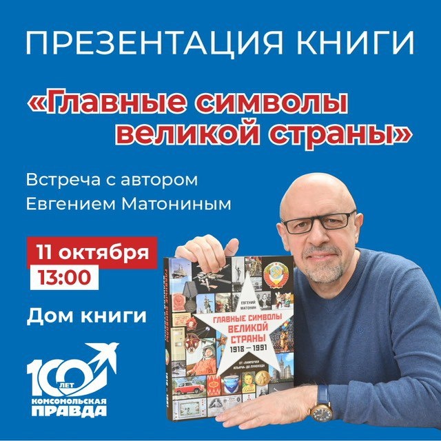Евгений Матонин, журналист и писатель, историк и сценарист, двукратный обладатель национальной премии «ТЭФИ» представит не просто книгу, а настоящую энциклопедию жизни советского человека - «Главные символы великой страны». Давно канули в Лету многие артефакты, но в сознании всплывают аромат маминых духов «Красная Москва», фотография улыбающегося Гагарина, передача «Спокойной ночи, малыши!». Эти символы живут в нас до сих пор и стали культурным кодом советской эпохи. Тысяча фотографий, увлекательный рассказ о множестве предметов, наполненный гордостью, юмором и ностальгией, позволят ощутить себя частью нашей большой истории. Ждем вас на презентации 11 октября в 13:00 «Дом книги» Вход свободный Подпишись на Комсомольскую правду: СПб — отдай свой буст нам