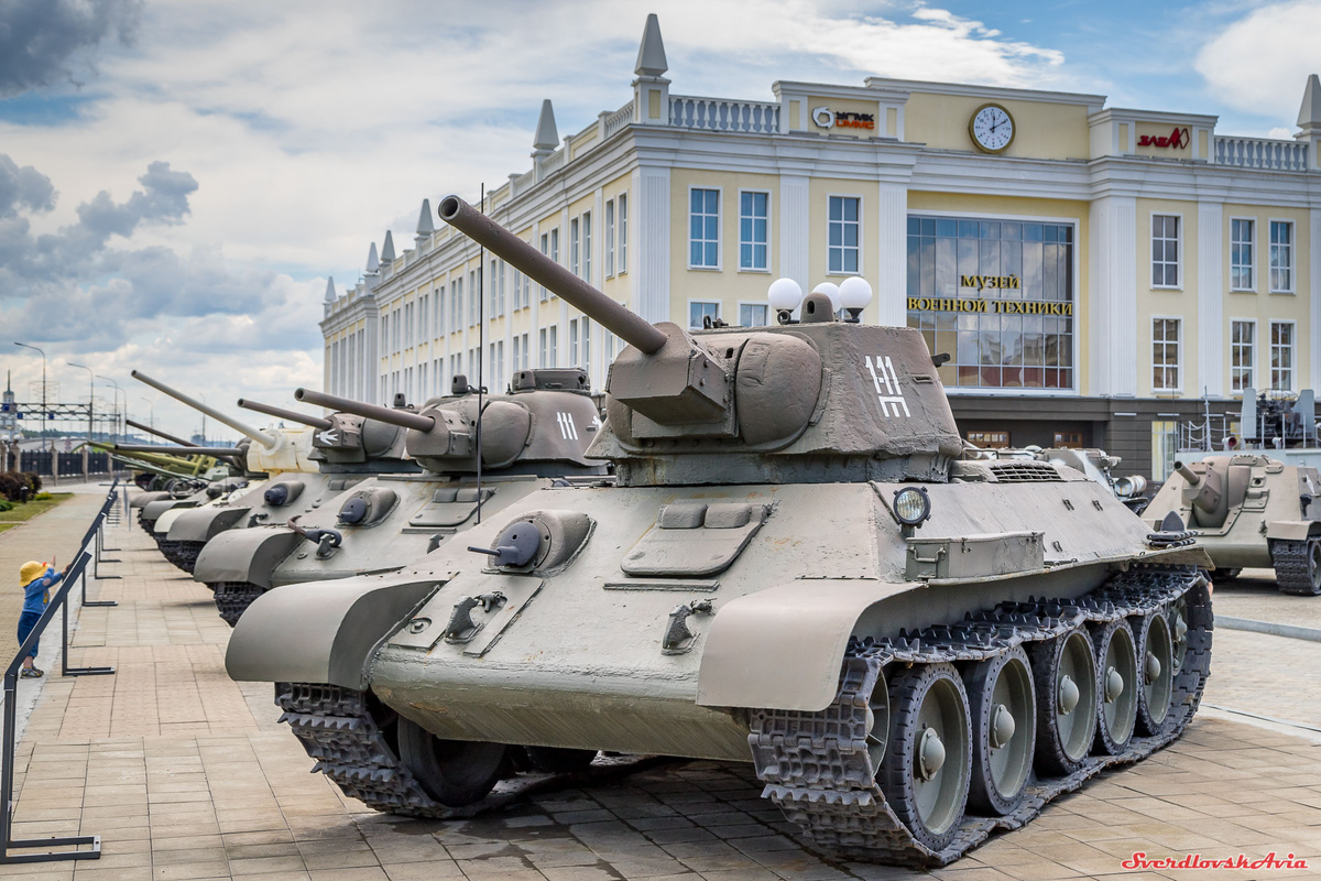 Речь пойдет о Музейном комплексе в Верхней Пышме. Верхняя Пышмá - город в Свердловской области, с населением 73 тысячи человек, является городом-спутником Екатеринбурга. Я слежу за развитием музея уже более десяти лет, и буквально каждый месяц он меня приятно удивляет появлением новых экспонатов. Сегодня третья часть рассказа, мы осмотрим военную технику на открытой площадке музея. В первых двух частях был рассказ о музее автомобилей и авиационной экспозиции, ссылки на них будут в конце рассказа. Предлагаю обзор экспозиции на момент начала июля 2025 года. Начнем с танков, в музее большая коллекция танков Т-34 различных модификаций. Самоходная установка СУ-14 на базе танка Т-35. Это не историческая машина, а вновь изготовленная по заводским чертежам "реплика". В музее воссоздано два танка Т-35, один в виде статичного экспоната, а второй в виде ходовой модели, которая принимает участие в исторических парадах 9 мая. Единственный оригинальный сохранившийся экземпляр танка Т-35 находится в