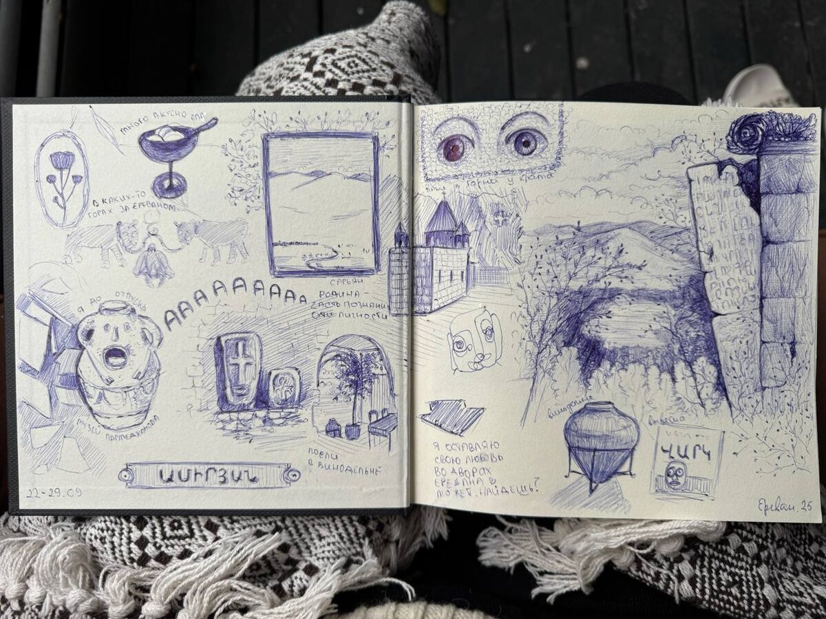 Про ведение визуального дневника и скетчинг Вот и начался годовой курс DW200! Первым делом нас попросили купить скетчбук, который понравится и полюбится, и начать вести там визуальный дневник. Фиксировать события, путешествия, поездки, мысли, исследования и многое другое. Зарисовывать их. И вот вторую неделю я делаю развороты. Первый из моей поездки в Ереван, а второй из моей поездки в глэмпинг в Тульской области. Постепенно на занятиях по курсу начали подключать ещё туш, а также разбирать все вместе какие-то кадры из фильмов и их композицию, пятна, фокус. Мне безумно нравится! Это супер разгружает мозги от компьютеров и телефонов, фиксирует воспоминания, моменты, а еще вот так я постепенно учусь выстраивать композицию на развороте, образы и историю. Ну и кайфую, конечно! Отдыхаю. Хожу, присматриваюсь ко всему, фотографирую разные детальки, мелочи, а затем все это зарисовываю. Жизнь ощущается полнее. В общем я пока в полном восторге от самой практики скетчинга и хочу попробовать ещ