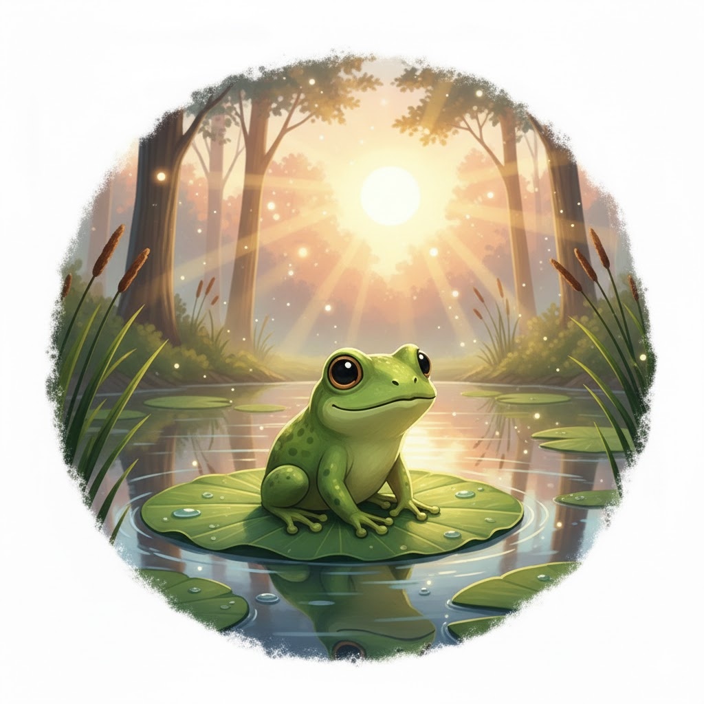 Однажды ранним утром Лягушонок Прыг-Прыг сидел на листе кувшинки и любовался рассветом. Солнце только-только выглянуло из-за камышей, и на каждой травинке блестели капли росы — словно крошечные звёзды, упавшие с неба. Рядом медленно ползла Улитка Скольз-Скольз. — Как красиво сегодня! — сказала она, глядя на отражение неба в воде. — Да, — кивнул Прыг-Прыг, — только посмотри, вон та капля на камышинке светится особенно ярко. Она будто сама сияет изнутри! Они подошли ближе. Капля действительно сверкала необыкновенным светом — голубым и мягким, словно в ней жила маленькая звёздочка. — Может, это и правда звезда, которая упала с неба? — шепнула Скольз-Скольз. — Надо узнать! — сказал Прыг-Прыг. — Но осторожно, чтобы не расплескать чудо! Он аккуратно подставил листик к капле. Капля скатилась на него и тихо зажурчала, словно маленький колокольчик. — Она поёт! — удивилась Скольз-Скольз. Вдруг капля заговорила тоненьким голоском: — Спасибо, что нашли меня! Я — капелька звёздного света. Ночью я