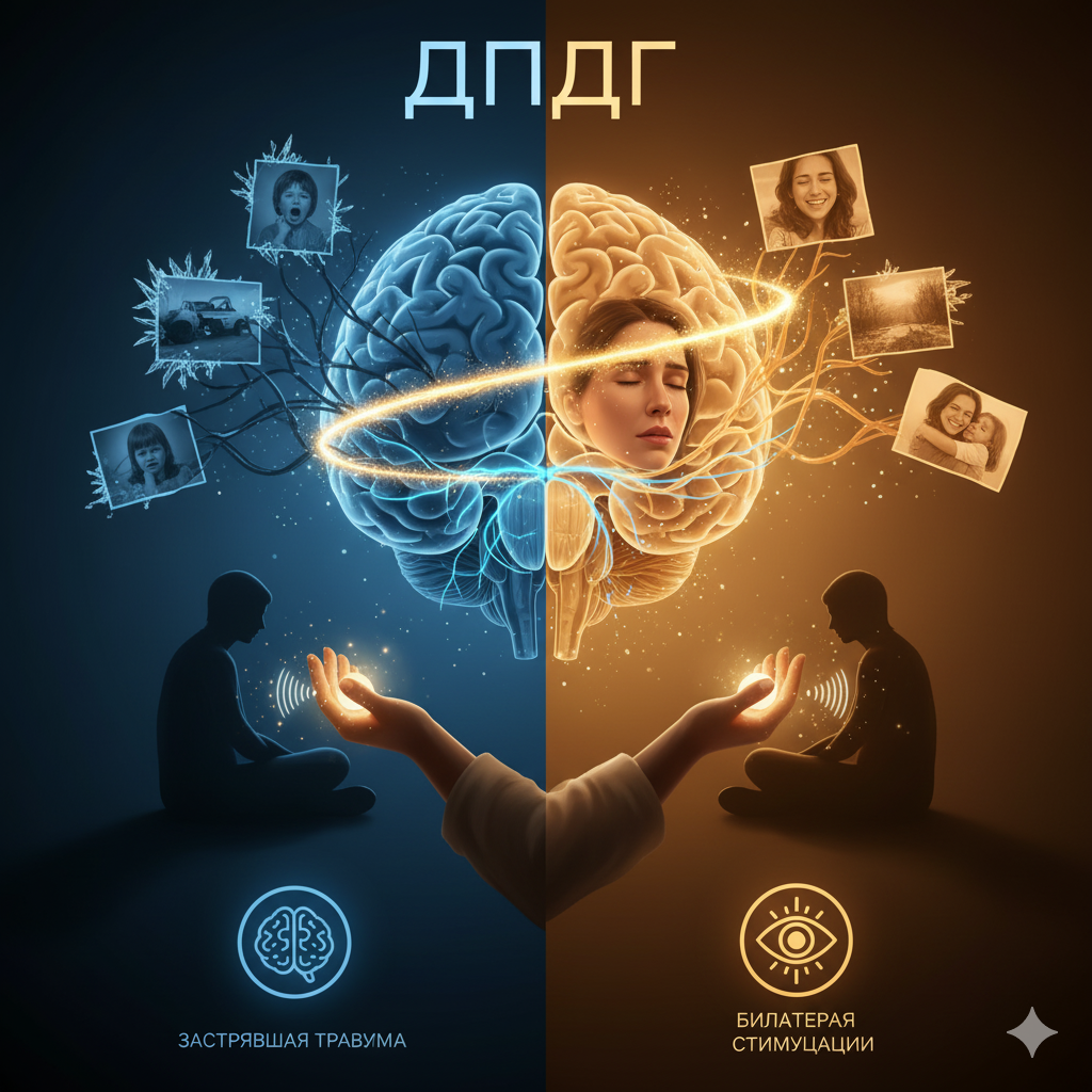 У нашего мозга два полушария: правое и левое. Они соединены посередине частью мозга, называемой мозолистым телом. Мозолистое тело выполняет работу по передаче мыслей, воспоминаний, эмоций и другой информации между двумя полушариями. Когда вы переживаете травмирующее событие, ваш мозг создает застывшее воспоминание, включая все физические и эмоциональные ощущения, которые вы испытывали в тот момент. Это иногда называют «воспоминанием-вспышкой» (фото-вспышки использовались со старыми камерами как источник света для фото), потому что образ застывает в вашем сознании в мельчайших деталях, и эти детали остаются там, практически не меняясь, годами. Важно отметить, что большинство воспоминаний чрезвычайно изменчивы и могут меняться даже от часа к часу. Воспоминания-вспышки — другие. Они «застревают» в нейронной сети памяти в определенной части вашего мозга и отрезаны от остальной его части. Всё, что соприкасается с этой «застрявшей» частью вашего мозга, будет негативно затронуто вашей травмой. Застрявшая травма может вызывать негативные мысли, чувства и поведение. И здесь на помощь приходит ДПДГ.