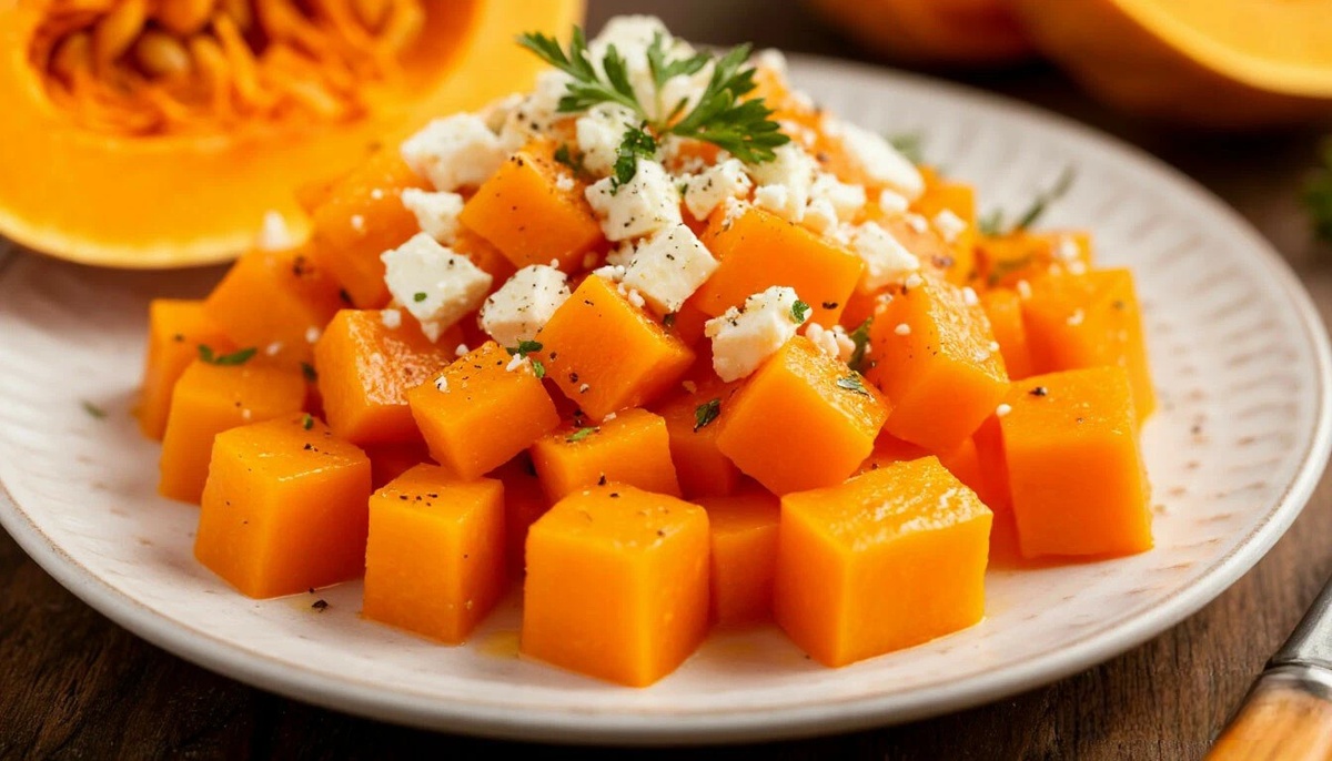 Это блюдо не только вкусное, но и полезное, так как тыква богата витаминами и минералами, а фета добавляет необходимые белки и кальций. Экспериментируйте с приправами и способами подачи, чтобы найти свой идеальный вариант! 1. Подготовка тыквы: Очистите тыкву от кожуры и удалите семена. Нарежьте тыкву кубиками среднего размера. 2. Приготовление заправки: В миске смешайте мёд, растительное масло, сушёный тимьян, соль и перец. 3. Запекание тыквы: Полейте тыкву приготовленной заправкой и тщательно перемешайте, чтобы каждый кусочек был покрыт. Посыпьте кунжутом. Выложите на противень, застеленный пергаментом. Запекайте в разогретой до 190°C духовке 25–30 минут. 4. Добавление феты: Достаньте тыкву из духовки. Посыпьте нарезанной кубиками фетой. Верните в духовку ещё на 10 минут, чтобы фета слегка расплавилась. Советы по приготовлению: Кусочки запеченной тыквы, покрытые расплавленной фетой, имеют аппетитный золотистый цвет. Поверхность слегка карамелизованная от запекания, а сыр образует румя
