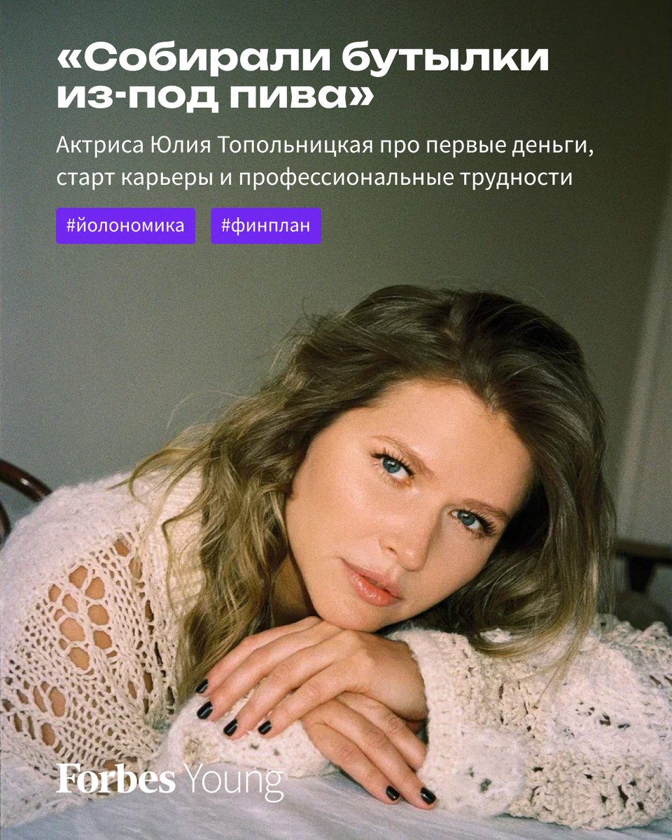 Актриса Юлия Топольницкая родилась в Санкт-Петербурге и с детства занималась балетом. Несмотря на хорошие результаты, после 11-го класса девушка поняла, что «любит сцену и хочет выражать себя не только в танце». Тогда Юлия поступила в Санкт-Петербургскую государственную академию театрального искусства (сейчас — РГИСИ) и бралась за разные подработки, чтобы обеспечить себя во время студенчества. Недавно Юлия Топольницкая снялась в комедийном сериале «Кинопоиска» «Баранкины и камни силы». «Это очень доброе кино о семье потомственных водителей такси, которые могут перевоплощаться, путешествовать во времени и останавливать его», — рассказывает Юлия, исполнившая в сериале роль старшей в роду извозчицы Варвары. Forbes Young пообщался с Юлией Топольницкой о трудностях актерской профессии, значимых покупках и о том, почему она не вкладывает деньги в сумки и туфли Первые деньги «Когда мне исполнилось 7 лет, мои родственники стали дарить мне деньги на дни рождения. Суммы были совсем небольши