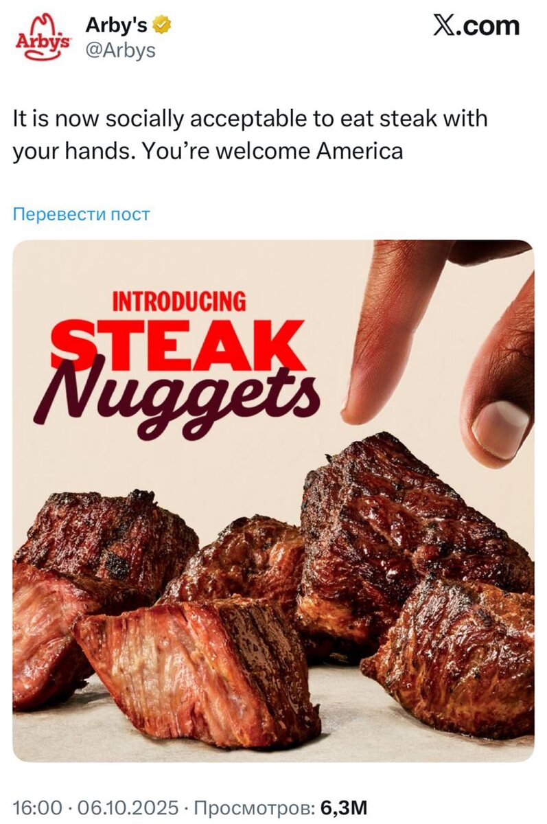 Кажется, человечество совершило полный круг. Американская сеть быстрого питания Arby’s, стремясь угодить поколению Z, с гордостью представила миру инновацию, от которой у любого человека старше 25 лет подергивается глаз. Продукт называется «Стейк-Наггетсы» (Steak Nuggets). Да, вы не ослышались. Что это такое? Если просто взять и описать этот продукт, то получится следующее: это кусочки стейка рибай, которые… жарят на открытом огне. После этого их можно взять руками и отправить в рот. Звучит знакомо? Поколение, выросшее на куриных наггетсах, очевидно, не стало заморачиваться с поиском названия для формата еды, который в остальном мире известен как «шашлык» или как минимум «кусочки мяса на огне». В Arby’s, впрочем, не видят ничего смешного и позиционируют это как «новый способ насладиться стейком» — без ножа и вилки, легко и удобно. По сути, они изобрели безотходный способ подачи мяса для тех, кто считает, что резать его — это уже слишком много работы. Реакция публики Соцсети, как водит