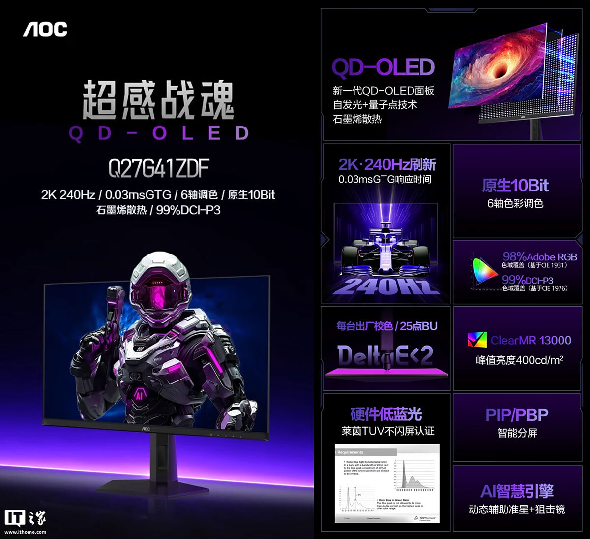 По сообщениям китайских СМИ, компания AOC выпустила на местном рынке два новых игровых QD-OLED монитора диагональю 27 дюймов: Q27G40ZDF и Q27G41ZDF. Основные характеристики мониторов идентичны, включая разрешение 2560 на 1440 пикселей и частоту обновления 240 Гц. Основное отличие в форме основания подставки. В модели Q27G40ZDF используется шестиугольное основание, а в Q27G41ZDF — пятиугольное. Источник изображения: AOC, ITHome Оба монитора обладают типичной яркостью 200 нит и пиковой яркостью 400 нит в режиме HDR, временем отклика 0,03 мс (GtG), высоким статическим коэффициентом контрастности 1500000:1 и сертифицированы по стандарту VESA ClearMR 13000, что должно гарантировать чёткость изображения в динамичных сценах. Источник изображения: AOC, ITHome Мониторы отличаются поддержкой 10-битной глубины цвета, 99-процентным охватом цветового пространства DCI-P3 и заводской точностью цветопередачи Delta E < 2, что соответствует требованиям к цветопередаче профессионального уровня. Поверхнос