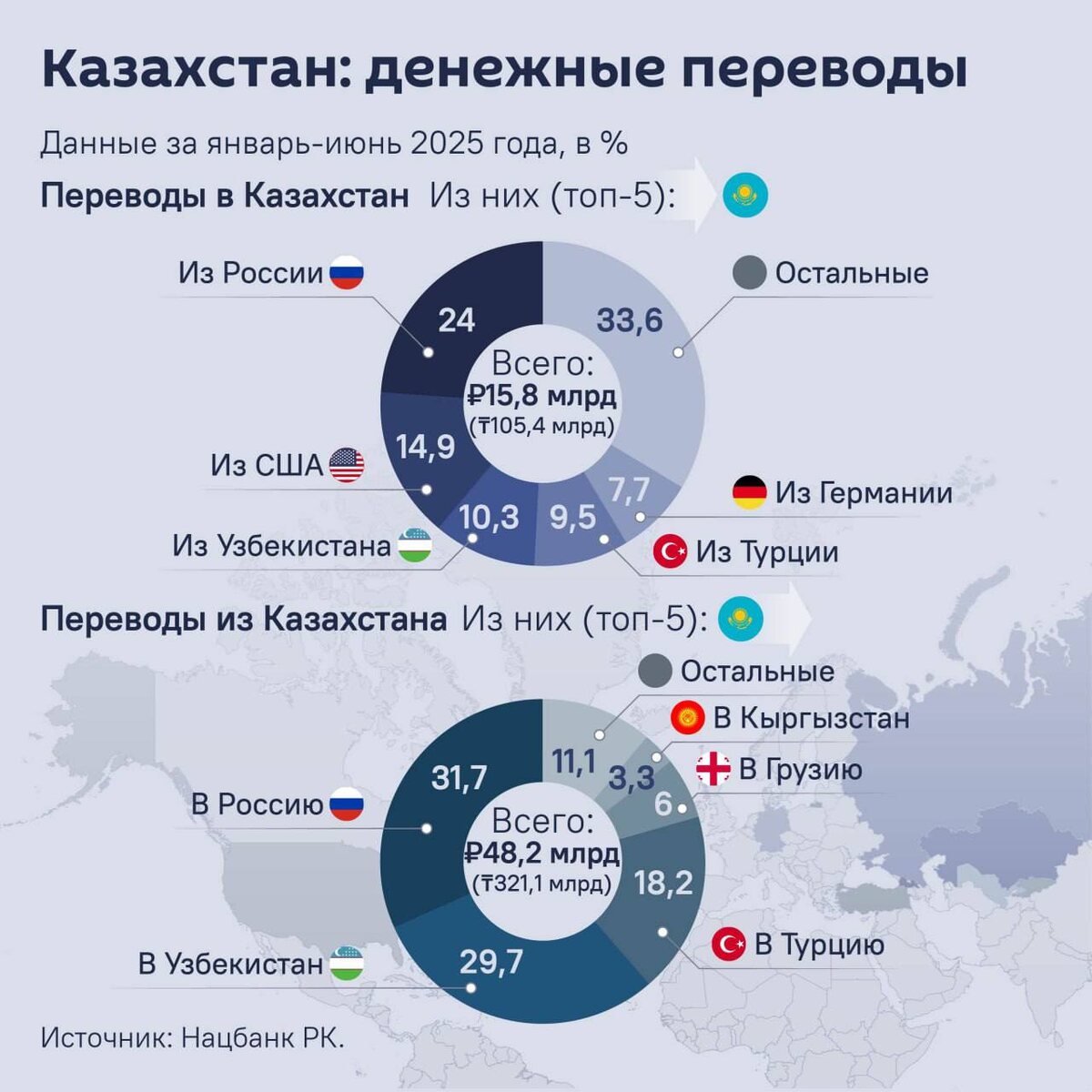 Объем отправленных в Россию средств за январь–август – это более 138 млрд тенге (21 млрд руб.). А полученных из России – порядка 5 млрд руб. (35,5 млрд тенге).