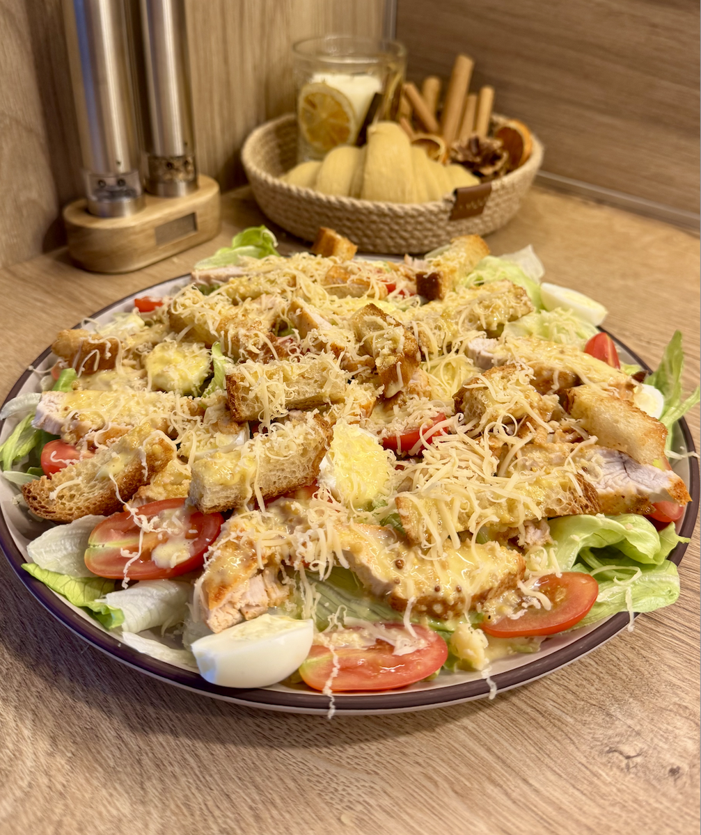 🧀 50 г пармезана (мелко натертого) 🔄 Всё смешайте блендером до однородной, шелковистой текстуры. Соус должен быть густым, ароматным и чуть цитрусовым — именно он делает Цезарь незабываемым. 🔥 Как готовить: 1. Обжарьте куриное филе со специями по 4–5 минут с каждой стороны — до золотистой корочки. 2. Подсушите хлеб с оливковым маслом и прованскими травами. 3. Порвите салат, добавьте черри и половинки перепелиных яиц. 4. Нарежьте курицу, выложите всё слоями, посыпьте сухариками и пармезаном. 5. Полейте домашним соусом — и почувствуйте Италию в каждой ложке 🇮🇹 Приятного аппетита! 💛 #сала