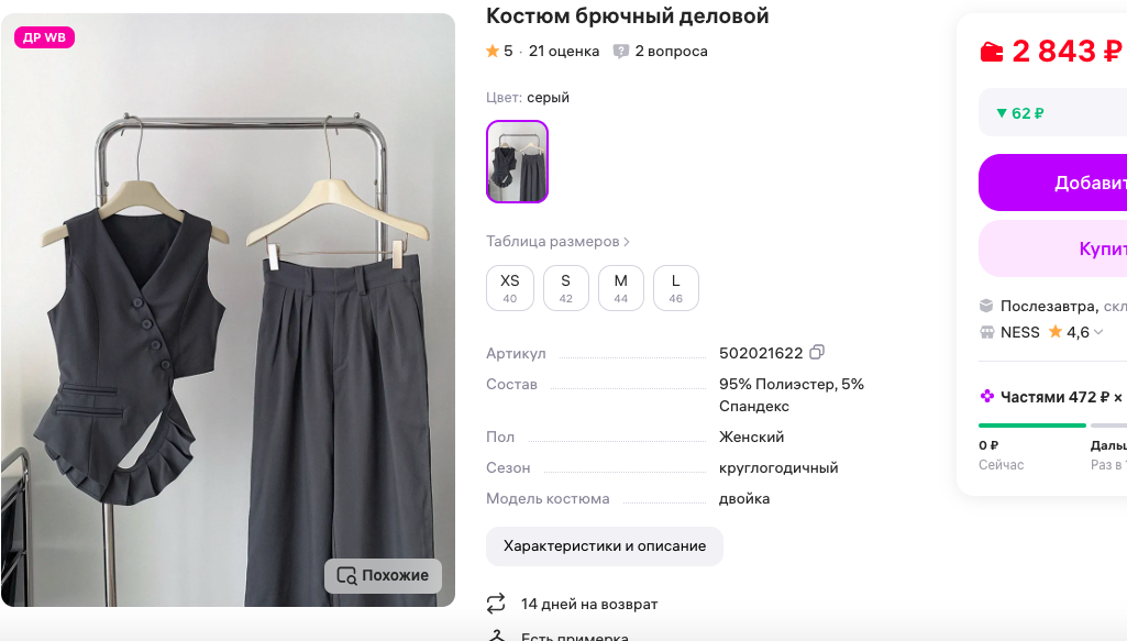Знаете, есть вещи, на которые смотришь — и уже представляешь, как начинаешь новый день: в одной руке — планер, в другой — уверенность. Вот такой этот костюм. Он словно создан для того, чтобы совмещать (казалось бы) несовместимое: серьёзные планы на день и лёгкий флирт с собственным отражением.