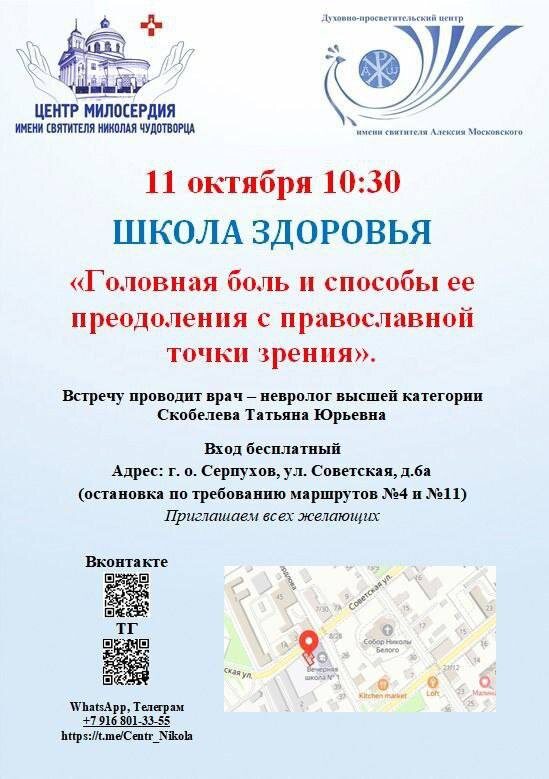 В Школе здоровья пройдет новая тематическая встреча Центр милосердия имени святителя Николая Чудотворца и Духовно-просветительский центр имени святителя Алексия Московского приглашают на встречу в Школе здоровья. Тема встречи: «Головная боль и способы ее преодоления с православной точки зрения». 11 октября,10:30. Ведущая: Врач-невролог высшей категории Татьяна Скобелева. Бесплатно. Адрес: Советская, 2а.