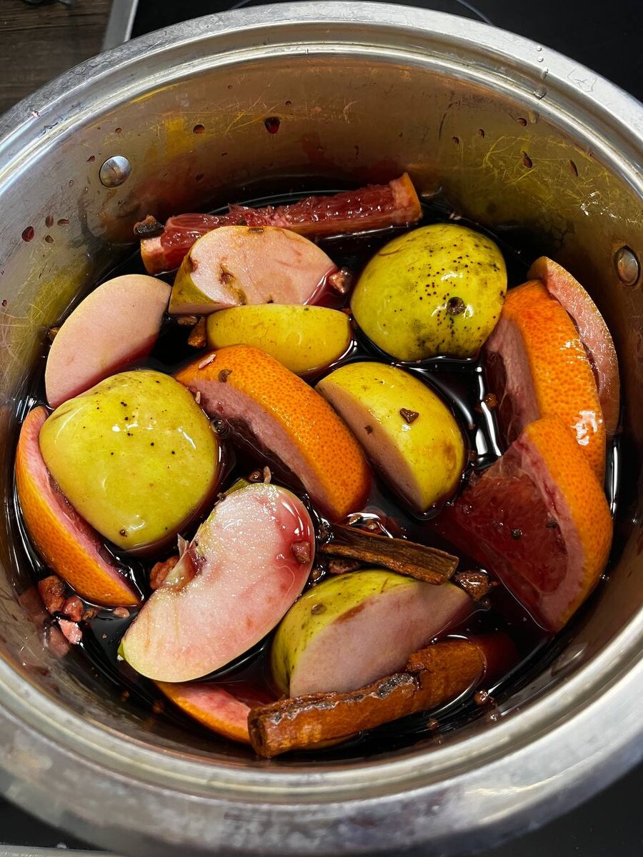 • На одну бутылку красного вина (у меня было Cabernet) беру одно яблоко и половину грейпфрута.