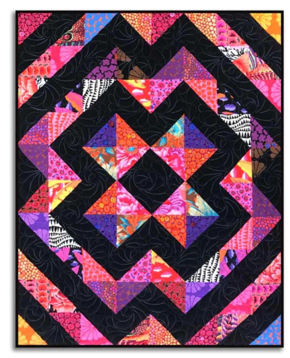 У Донны Джордан много различных проектов для шитья лоскутных изделий. Этот показывает как можно использовать треугольники в квадрате. Процесс шитья очень простой, детали крупные и с ним справится даже новичок. Размер изделия в готовом виде 73” x 91” или 33” х 41”. Расход ткани для первого размера: 40 цветных квадратов размером 10”; 40 квадратов размером 10” из фоновой ткани; 3/4 ярда для окантовки; 5 1/2 ярда для обратной стороны изделия. Инструкции по шитью: 1. На обратной стороне всех квадратов из фоновой ткани провести диагональ. Совместить квадраты из фоновой ткани с цветными. 2. Проложить 2 строчки на расстоянии 1/4” с каждой стороны диагонали. 3. Разрезать по диагонали. Шов заутюжить на цветную ткань. Размер квадратов с припусками 9 5/8”. Сшить 80 треугольников в квадрате. Разложить блоки как показано на шаблонах. Сшить в ряды. Ряды сшить между собой. Простегать и окантовать. Второй размер: 33” х 41”. Все тоже самое, только надо использовать квадраты размером 5”. 3/8 ярда д