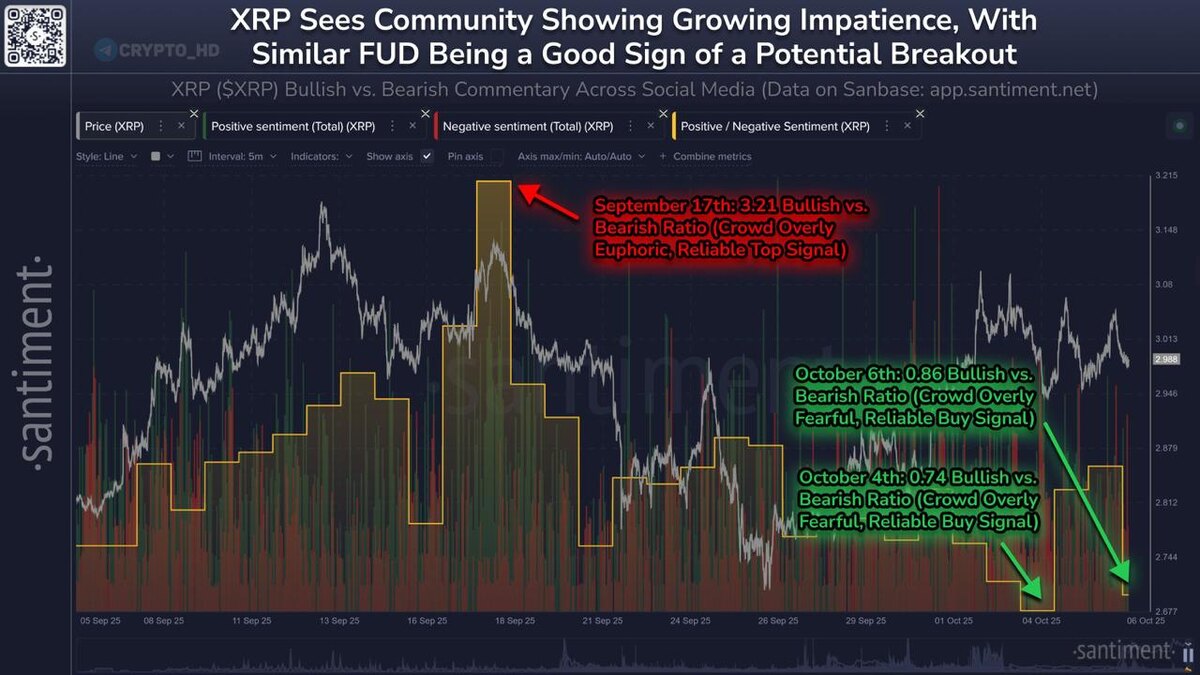 📊 Santiment: Уровень негативных настроений вокруг #XRP – максимум за 6 месяцев! Количество медвежьих прогнозов значительно превышает бычьи. Crypto Headlines