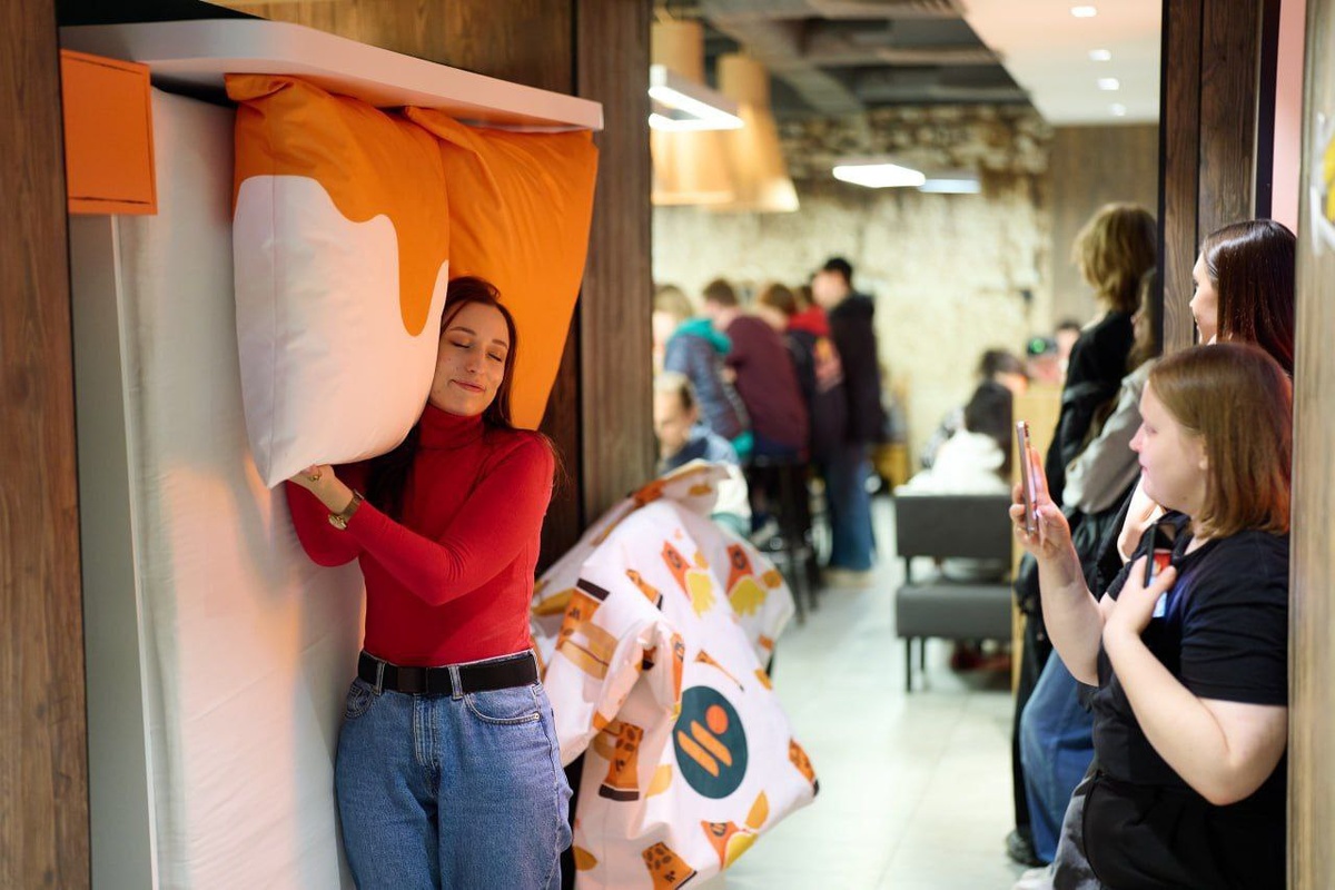 Но и это ещё не всё - в кафе появились даже инсталляции в виде кровати и утреннего душа. А ещё везде развесили часы, разделённые на часовые пояса России, на которых всегда ранее утро
