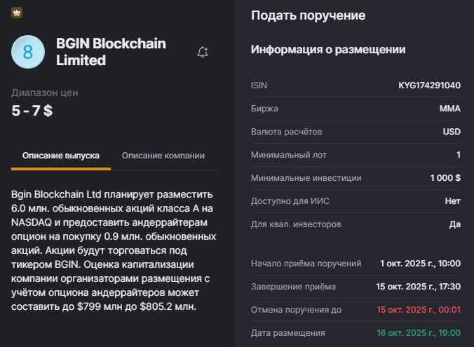 #IPO 📌 Краткий разбор IPO BGIN Сфера бизнеса: Производитель оборудования для майнинга альтернативных криптовалют (Kaspa, Alph, RXD, Aleo). Регистрация: Каймановы острова, деятельность — Сингапур, Гонконг, США. Тикер: BGIN (NASDAQ). Объём IPO: 6 млн акций (плюс 0.9 млн в опционе андеррайтера). Ожидаемый флоат: всего 5.2–5.9%. Организатор: D. Boral Capital. Оценка капитализации: $799–805 млн (по цене размещения). https://teletype.in/@vadim_gr777/Zpd0WpUEHq-