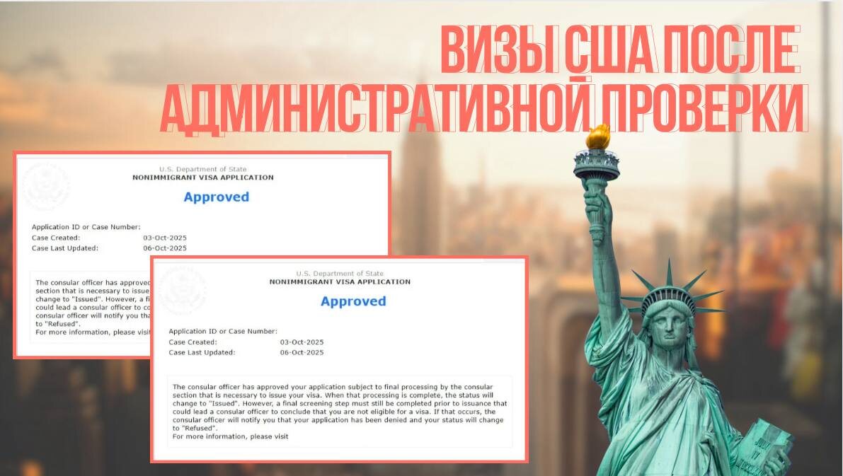 Визы США после административной проверки 🇺🇸 7 октября: одобрение виз США после административной проверки гражданам РФ. Собеседование было назначено до последних изменений. Кейс: супружеская пара. Женщина работает специалистом по уходу. Мужчина является юристом. У женщины была непродолжительная поездка в США, а для мужчины – виза первичная. В США проживает дочь, гражданка Америки, запланирована поездка к ней. За последние 5 лет было посещено 3 страны. Вопросы консула: – Какая цель вашей поездки? – Кто оплачивает поездку? – Вы работаете? – Где вы работаете? – У вас есть недвижимость в собственности? – Откуда вы прилетели? После ответов на вопросы офицер сказал, что нужно время для принятия решения и забрал паспорта. Но на следующий день пришло уведомление, что визы одобрены! 🇺🇸 Наши специалисты постоянно находились на связи с Клиентами! Получить визу США ⬅️ Записаться на консультацию ⬅️ #кейс #виза_сша