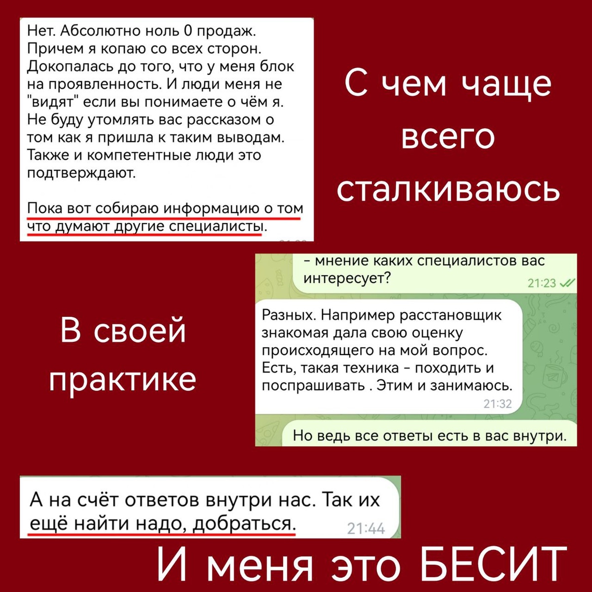 Что же меня так бесит в моей практике? А то, что встречаются люди, которые бегают по помогающим практикам и ждут, что те про них расскажут "что для них будет лучше". Кто-то скажет мне как для меня лучше!!! 🤔 Ну комон.... Люди, так не бывает. Прекратите обманывать себя. Признайтесь себе в своей детской позиции и нежелании взять ответственность за свою жизнь. Это хотя бы будет честно по отношению к себе. Тогда когда другие люди нас знают и понимают лучше нас самих - это очень и очень печальный звоночек. Это лишь значит, что я себя не слышу, не чувствую и не понимаю. В этом случае, у меня потерян контакт с собой. Это ещё пол беды. Но, когда люди даже пытаться не хотят поискать ответы внутри, прислушаться к себе, и предпочитают бегать и искать ответов у других специалистов: - а тем ли я занимаюсь? - где мои клиенты? - в чем мои таланты? - буду ли я успешна? - тот ли мужчина рядом? - как мне так выстроить свою жизнь, чтобы соблюдать баланс личного и рабочего? то тут вообще беда. Это з