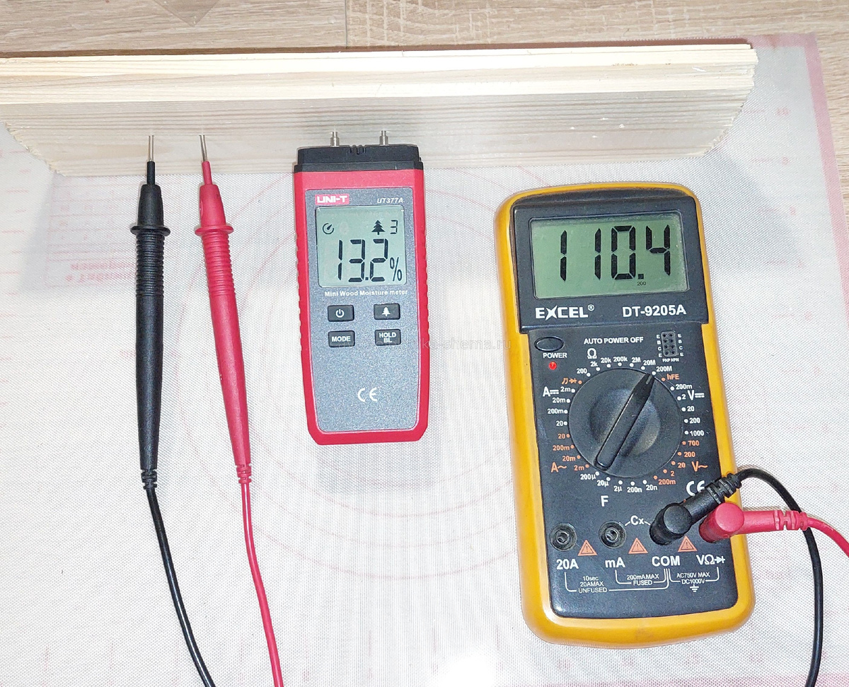 Для измерения влажности древесины существуют специальные приборы, цена которых примерно сопоставима с хорошим мультиметром и выше. Этот тип измерителя работает по принципу измерения сопротивления между двумя щупами, расстояние между которыми ровно 20 мм. Теперь нужно понять при каком сопротивлении будет показываться тот или иной процент влажности. В приборе имеется четыре настройки на разные виды древесины, в зависимости от её плотности сопротивление будет разное, например тополь при сопротивлении 2 МОм будет иметь влажность 17%, а берёза 23%. При сопротивлении 20 МОм будет уже 13% у тополя и 18% у берёзы, а дальше при 250 МОм тополь 10% и 14,5% берёза. Попробуйте найдите теперь такой мультиметр, который может измерять сопротивление больше 200 МОм и иметь стоимость ниже специального измерителя влажности древесины. Делаем вывод что обычный мультиметр сможет измерить влажность только на свежераспиленной древесине и через пару недель сушки на открытом воздухе под навесом он уже вряд ли с