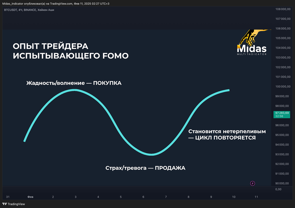 FOMO проявляется практически во всех рыночных циклах, независимо от типа актива. Это естественное человеческое явление, которое проходит через несколько фаз – от роста цены до плато, затем разворота и падения до минимума, после чего цикл повторяется. Неопытные трейдеры часто начинают действовать только когда тренд уже меняется, что лишь усиливает эффект FOMO.