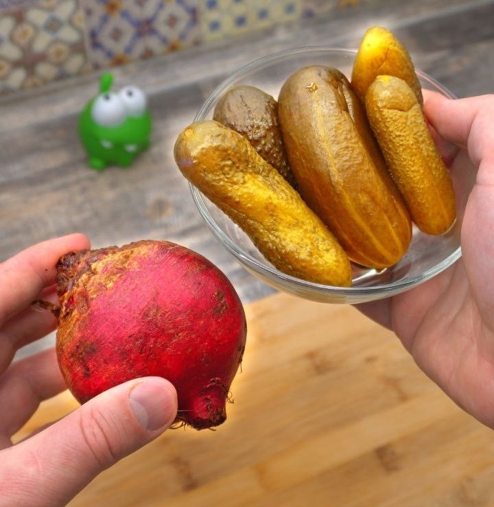 💡 Совет: для более выразительного вкуса можно использовать запечённую свёклу — она получается сладковатой и ароматной. - Подготовьте огурцы.