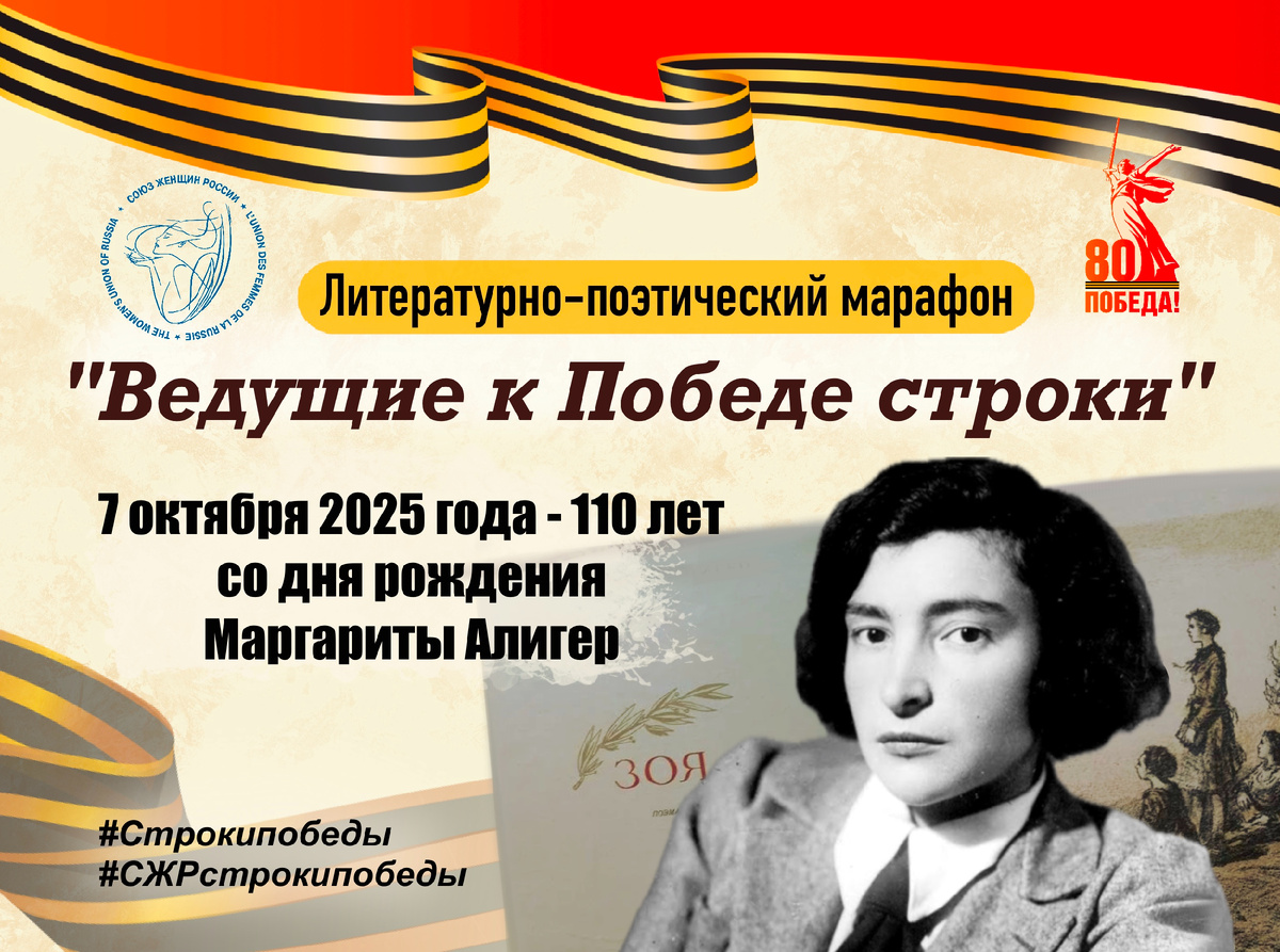 С самого начала Великой Отечественной войны Маргарита Алигер работала военным корреспондентом и по заданиям редакции часто выезжала на фронт. Год провела в блокадном Ленинграде. Ее стихотворения звучали по радио и печатались в газетах. В 1942-1943 году Алигер написала две свои наиболее известные поэмы: «Твоя победа» и «Зоя», посвященной подвигу Зои Космодемьянской. Незабываемые поэтические строки передаются от поколения к поколению, укрепляют нашу веру в Победу, помогают преодолевать испытания, согревают любовью сердца близких и дорогих людей. 🔴В Год защитника Отечества Союзженщин России продолжает литературно-поэтический марафон «Ведущие к Победе строки». ➡️О том, как принять участие в Марафоне, читайте в сообществе ВКонтакте! #союзженщинроссии #сжр