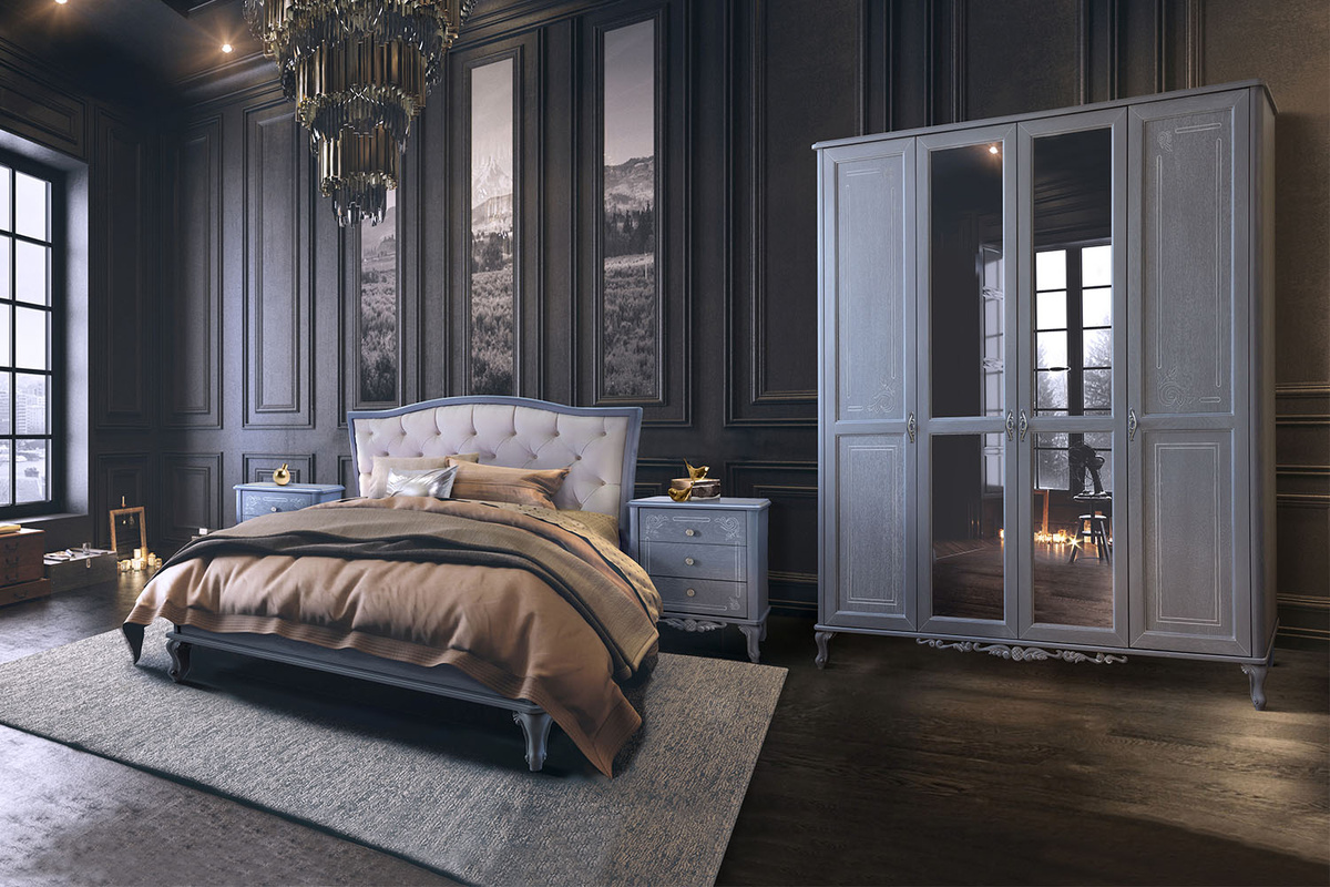- Кровать — центр композиции, отличается устойчивым основанием, удобной спинкой и возможностью выбора ортопедического матраса.