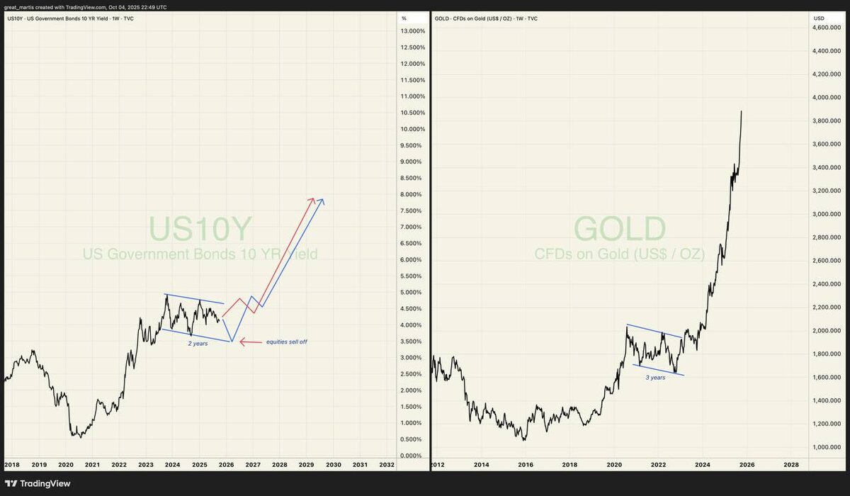 Золото и доходность облигаций: тишина перед бурей Если смотреть на эти два графика — доходность 10-леток США и золото — видно одно: они оба стоят в долгом боковике. И это не просто совпадение. Когда доходности консолидируются годами, это обычно значит, что рынок капитала готовится к смене эпохи. Как только диапазон прорывается вверх — начинается фаза, где деньги текут иначе: старые модели оценки рушатся, золото взлетает, облигации падают, акции получают удар. На графике слева — 10-летние облигации США: два года накопления. Следующий импульс — возможный рост доходностей до 7–8%, что исторически вызывает распродажи на фондовом рынке. На графике справа — золото. После трёх лет боковика оно выстрелило, как это уже бывало в 70-х, когда ставки и инфляция росли вместе. К чему всё идёт? К миру, где деньги снова стоят дорого, а золото и биткоин — становятся не просто активами, а убежищем. Мы входим в финальный акт старой финансовой системы. Хотите, покажу, как эта связка «доходность — золо