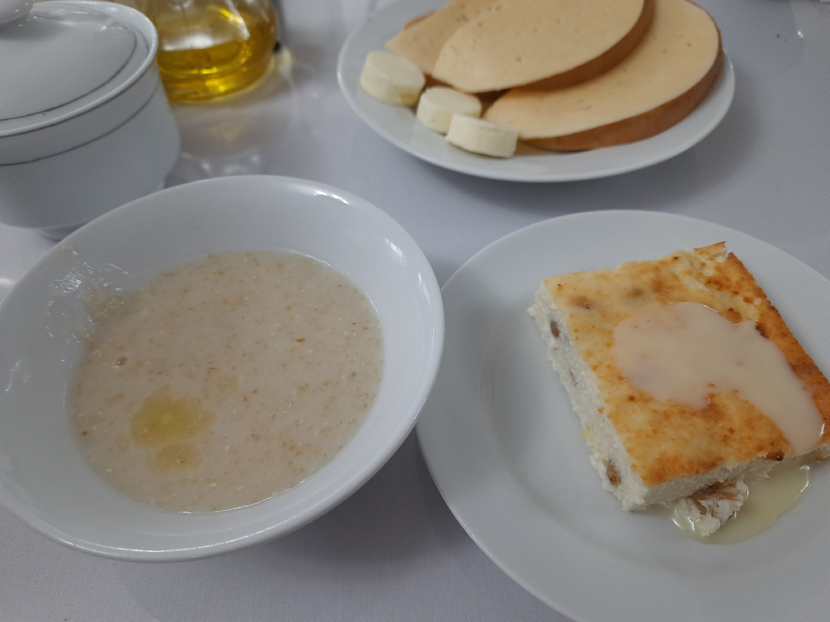 Пятый день был воскресеньем. Процедур нет, поэтому для отдыхающих предлагалась бесплатная экскурсия по маршруту Малый Иерусалим. И мы сначала на неё собирались. Но накануне так устали гулять по Евпатории, что решили в воскресенье просто отдохнуть перед нелёгкой неделей с процедурами)). Тем более, что по Малому Иерусалиму мы гуляли 2 дня. Завтрак был таким, как я люблю: каша, творожная запеканка и бутерброды с маслом и сыром. Правда, дома я ем что-то одно, либо кашу, либо запеканку. А тут с удовольствием съела всё! Бутерброды мы забрали с собой в номер, где заварили турецкий кофе, который накануне купили в Евпатории. После завтрака отправились гулять по территории санатория с наушниками в ушах. Гуляли порознь, потому что мне надо сфотографировать каждый цветочек, а Андрей гулял по спортивной площадке, там покрытие хорошее). Я ходила и любовалась каждым растением и каждым цветочком). Некоторые из них мне знакомы, а некоторые нет. Например, вот такое хвойное дерево с мелкими голубыми