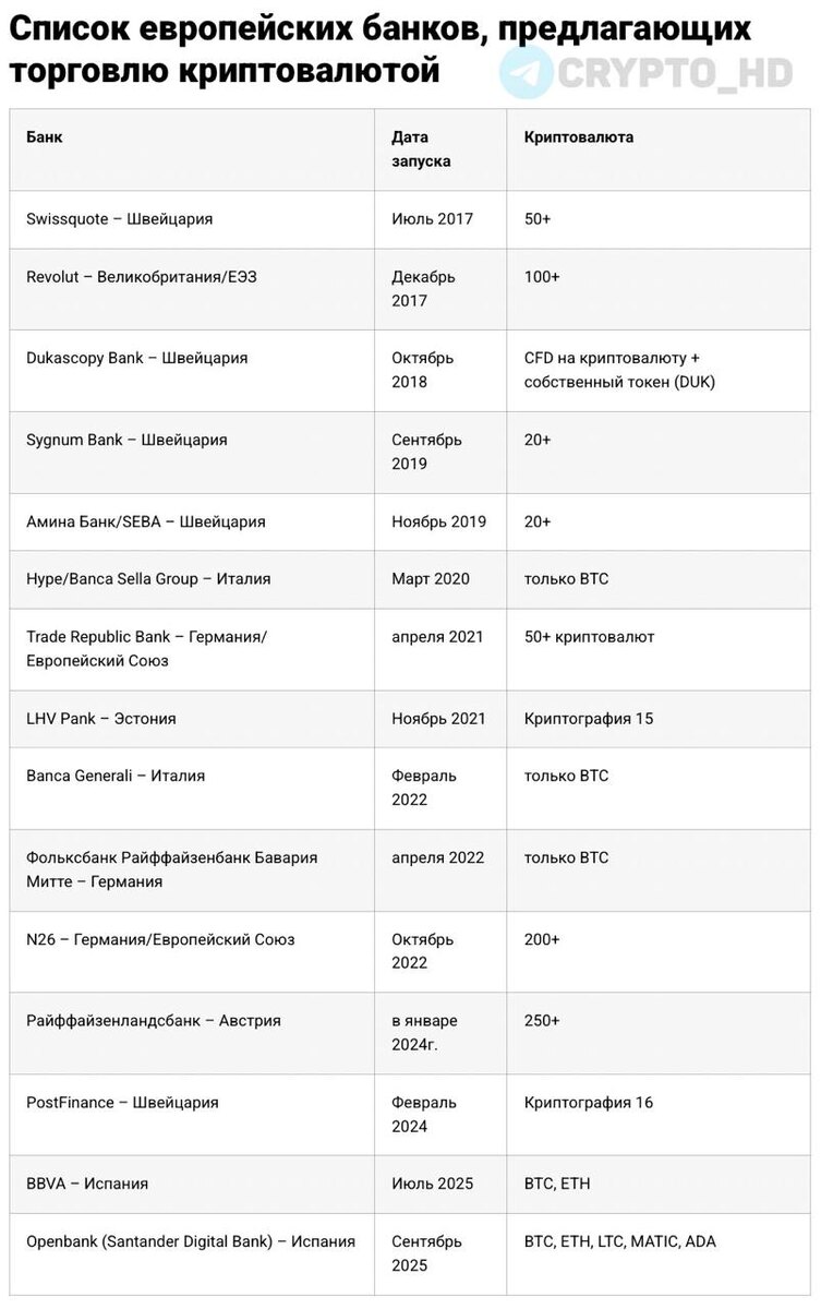 🇪🇺 Европейские банки, предлагающие торговлю криптовалютой: ➤ Swissquote (Швейцария) – с июля 2017 года. ➤ Revolut (Великобритания / ЕЭЗ) – с декабря 2017 года. ➤ Dukascopy Bank (Швейцария) – с октября 2018 года. ➤ Sygnum Bank (Швейцария) – с сентября 2019 года. ➤ Amina Bank/SEBA (Швейцария) – с ноября 2019 года. ➤ Hype/Banca Sella Group (Италия) – с марта 2020 года. ➤ Trade Republic Bank (Германия/ЕС) – с апреля 2021 года. ➤ LHV Pank (Эстония) – с ноября 2021 года. ➤ Banca Generali (Италия) – с февраля 2022 года. ➤ Volksbank Raiffeisenbank Bayern Mitte (Германия) – с апреля 2022 года. ➤ N26 (Германия/ЕС) – с октября 2022 года. ➤ Raiffeisenlandesbank (Австрия) – с января 2024 года. ➤ PostFinance (Швейцария) – с февраля 2024 года. ➤ BBVA (Испания) – с июля 2025 года. ➤ Openbank (Santander Digital Bank, Испания) – с сентября 2025 года (источник) Crypto Headlines