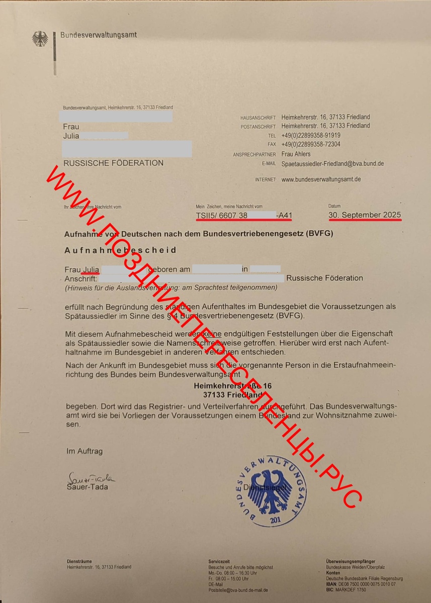 СТАТИСТИКА: 03.05.2025 отправка комплекта документов. 09.05.2025 присвоение номера дела. 03.06.2025 запрос дополнительных документов, а именно архивную справку на деда с указанием в составе семьи его родителей, которые находились вместе с ним на спецпоселении. 30.07.2025 отправка запрошенных документов. 16.09.2025 письмо от БФА о том, что документы все проверены и в ближайшее время будет выслано заключительное решение по делу заявительницы. 30.09.2025 ВЫЗОВ ПОЛУЧЕН. ИТОГО: 5 МЕСЯЦЕВ. НАЦИОНАЛЬНОСТЬ: В СОБ была дополнена с "ПРОЧЕРКА" на "НЕМКА" по решению ЗАГС. НАЦИОНАЛЬНОСТЬ: В СОР ребёнка была дополнена с "ПРОЧЕРКА" на "НЕМКА" по решению ЗАГС. ПОДТВЕРЖДЕНИЕ ЗНАНИЙ НЕМЕЦКОГО ЯЗЫКА: Goethe-Zertifikat B1 des Goethe-Institutes все 4 модуля. Мы