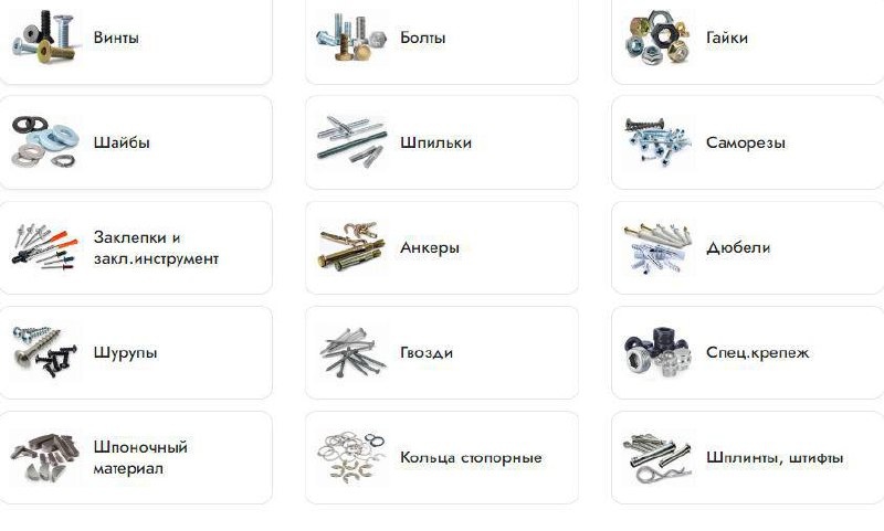 👉 АНКЕРА Они используются для конструкций, которые требуют большой ответственности, например, тяжелые подвесные конструкции. Этот крепеж считается самым надежным и долговечным. 👉 САМОРЕЗЫ Саморезы различаются по длине, толщине, материалу, форме и назначению. Производятся из специальной закаленной стали и защищены от коррозии. Бывают оцинкованные (желтого и серебристого цвета) и черные (оксидированные или фосфатированные). 👉 МЕТРИЧЕСКИЙ КРЕПЕЖ Используется для решения разнообразных задач. Делится на подвиды: болты, гайки, винты, шпильки. Метрический крепеж считается самым востребованным, он используется во всех сферах производства и жизнедеятельности человека. 👉 ГВОЗДИ Существует множество видов гвоздей, например, строительные, толевые, кровельные, шиферные, винтовые, финишные, ершенные и другие. Все они отличаются по назначению и внешнему виду. 👉 ШУРУПЫ Шурупы используются для соединения мягких поверхностей, например, для дерева или пластика. Они бывают закаленные и
