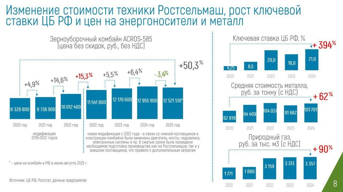 При этом зерноуборочный комбайн ACROS-585 в 2023 году по сравнению с 2022 годом подорожал только на 5,5%, в 2024 году по сравнению с 2023 годом — на 6,4%, а в 2025 году по сравнению с 2024 годом цена на него снизилась на 3,4%, до 12,5 млн руб. (указана цена комбайна в РФ в июле-августе 2025 года).