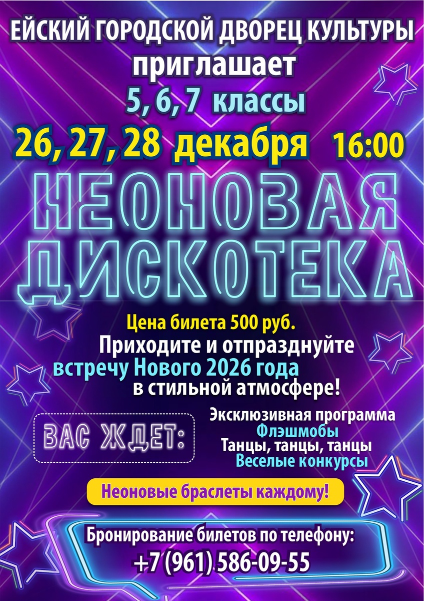Встретим Новый 2026 год ярко ✨ Приглашаем учеников 5, 6 и 7 классов на неоновую вечеринку в Ейском дворце культуры с 26 по 28 декабря. ▫Вас ждёт: – эксклюзивная праздничная программа; – неоновые флэшмобы и зажигательные танцы; – весёлые конкурсы и активные игры. И главное — каждому участнику подарок: яркий неоновый браслет. Для справок и бронирования: +7 (961) 586-09-55 — Оксана Геннадьевна, художественный руководитель Ейского городского дворца культуры. Подписывайтесь: @gdk_ejsk