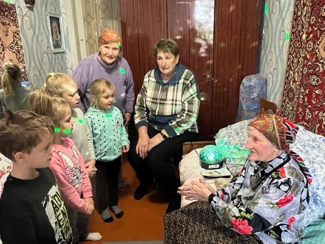 День пожилых людей отмечается 1 октября. Второе название этого дня — день добра и уважения. Это любимый многими праздник и ценный повод сказать теплые слова и сходить в гости к своим близким. В их добрых и сильных сердцах черпаем мы поддержку и понимание, терпение и любовь, энергию и вдохновение. Педагоги и воспитанники старшей группы детского сада «Жар-птица» пришли в гости к жительнице микрорайона «Алмазный», ветерану Зое Дмитриевне Косянчук с подарками, накануне сделанными своими руками, и музыкальным поздравлением, ведь в эту золотую осеннюю пору она отмечает свой 90-летний юбилей. Пожелаем Зое Дмитриевне доброго здоровья, бодрости духа, долгих счастливых лет жизни. Пусть преклонные годы не станут поводом для уныния, а жизненных сил хватит надолго! Дети, педагоги и именинница получили массу положительных эмоций, любовь и внимание!