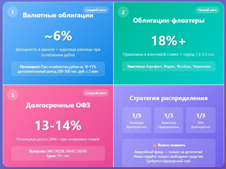 В первой части мы говорили о том, что банковские депозиты больше не решают задачу сохранения капитала при высокой инфляции. Теперь разберем конкретные инвестиционные инструменты, которые можно применить для семейных накоплений. 1. Эксперты советуют смотреть на облигации, номинированные в валюте. В среднесрочной перспективе высока вероятность ослабления рубля из-за сезонных факторов и показателей экспорта-импорта. Такие облигации дают доходность около 6% в валюте, плюс возможен рост из-за курсовой разницы. Для семьи с накоплениями 2 миллиона рублей это означает двойную защиту. Во-первых, 6% годовых в долларах или евро при текущих курсах. Во-вторых, если рубль ослабнет на 10-15% за год, дополнительный доход составит еще 200-300 тысяч рублей. Валютные облигации подходят для части накоплений, которые семья не планирует тратить в ближайшие 2-3 года. 2. Второй инструмент — облигации-флоатеры, привязанные к ключевой ставке. Таких много: Аэрофлот, Яндекс, ФосАгро, Черкизово. Купон определяетс